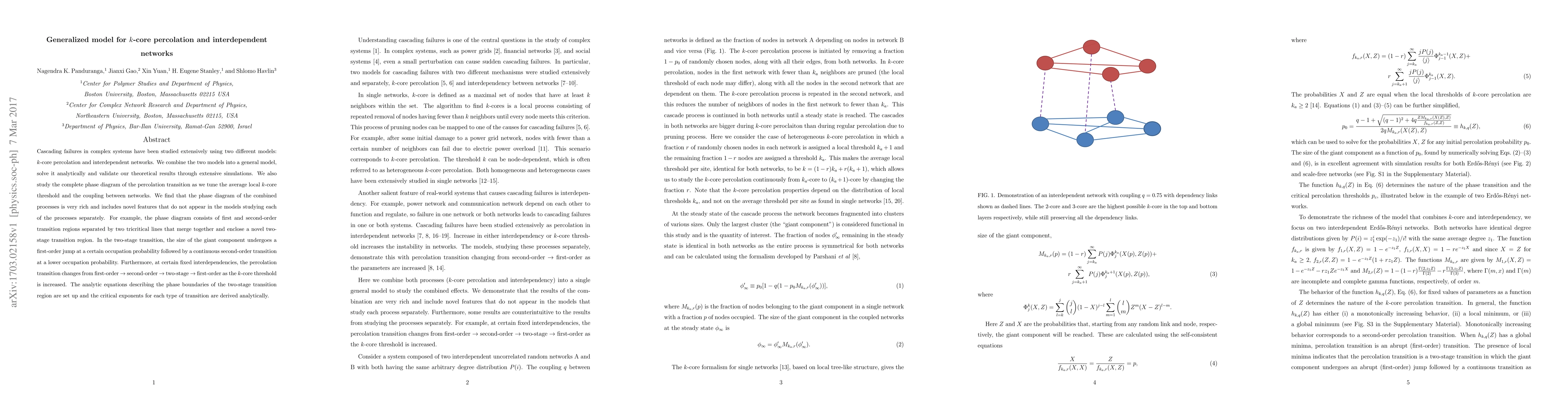 This paper combines $k$-core percolation and interdependent networks into a generalized model, solving it analytically and validating results through simulations. It reveals a rich phase diagram with novel features, including a two-stage transition region and a transition from first- to second-order and back, with derived critical exponents.