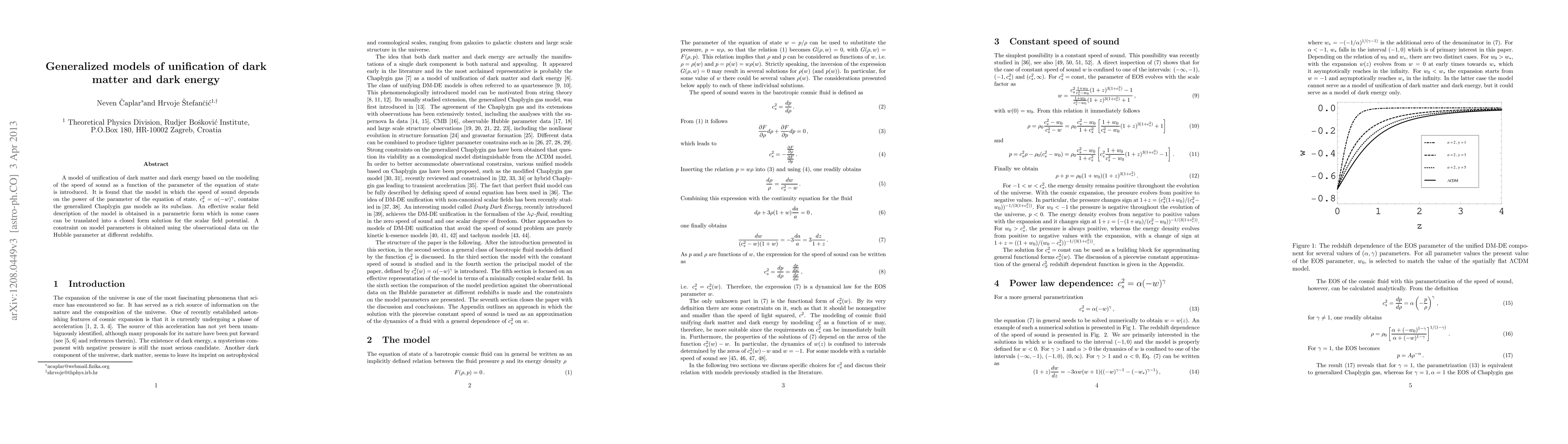 A new model unifies dark matter and dark energy by linking their properties to the speed of sound, which depends on a parameter that affects the universe's expansion rate. The model has been constrained using observational data and can be translated into a closed-form solution in some cases.