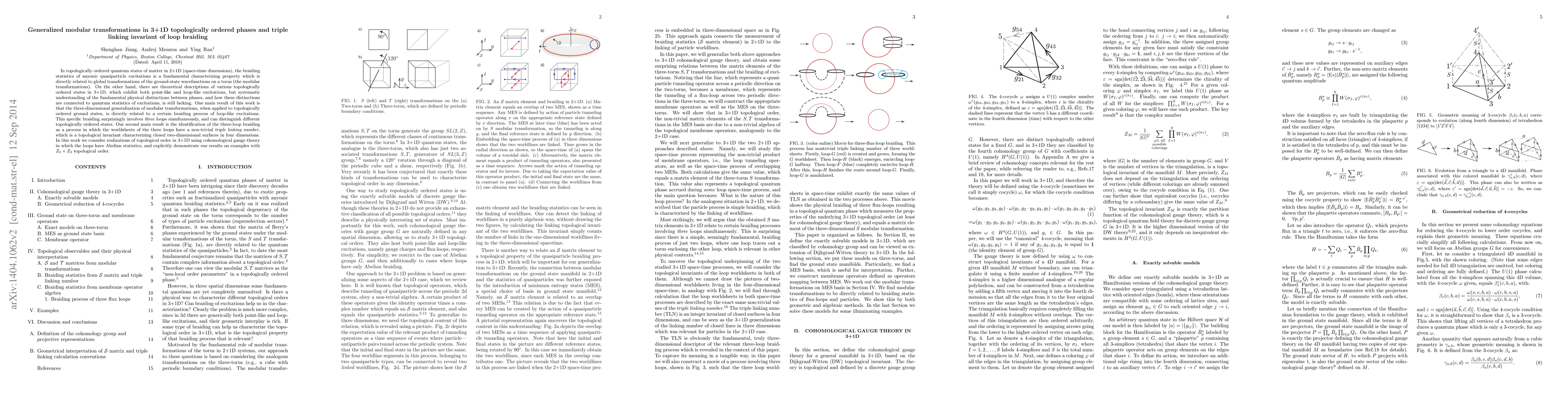 In topologically ordered quantum states of matter in 2+1D (space-time dimensions), the braiding statistics of anyonic quasiparticle excitations is a fundamental characterizing property which is directly related to global transformations of the ground-state wavefunctions on a torus (the modular transformations). On the other hand, there are theoretical descriptions of various topologically ordered states in 3+1D, which exhibit both point-like and loop-like excitations, but systematic understanding of the fundamental physical distinctions between phases, and how these distinctions are connected to quantum statistics of excitations, is still lacking. One main result of this work is that the three-dimensional generalization of modular transformations, when applied to topologically ordered ground states, is directly related to a certain braiding process of loop-like excitations. This specific braiding surprisingly involves three loops simultaneously, and can distinguish different topologically ordered states. Our second main result is the identification of the three-loop braiding as a process in which the worldsheets of the three loops have a non-trivial triple linking number, which is a topological invariant characterizing closed two-dimensional surfaces in four dimensions. In this work we consider realizations of topological order in 3+1D using cohomological gauge theory in which the loops have Abelian statistics, and explicitly demonstrate our results on examples with $Z_2\times Z_2$ topological order.