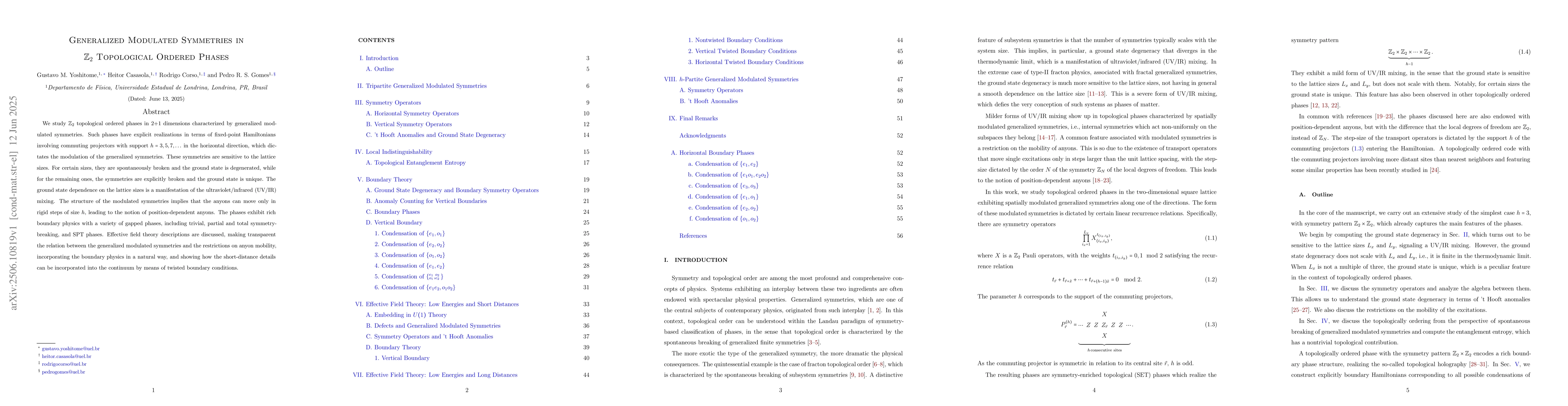 We study $\mathbb{Z}_2$ topological ordered phases in 2+1 dimensions characterized by generalized modulated symmetries. Such phases have explicit realizations in terms of fixed-point Hamiltonians involving commuting projectors with support $h=3,5,7,\ldots$ in the horizontal direction, which dictates the modulation of the generalized symmetries. These symmetries are sensitive to the lattice sizes. For certain sizes, they are spontaneously broken and the ground state is degenerated, while for the remaining ones, the symmetries are explicitly broken and the ground state is unique. The ground state dependence on the lattice sizes is a manifestation of the ultraviolet/infrared (UV/IR) mixing. The structure of the modulated symmetries implies that the anyons can move only in rigid steps of size $h$, leading to the notion of position-dependent anyons. The phases exhibit rich boundary physics with a variety of gapped phases, including trivial, partial and total symmetry-breaking, and SPT phases. Effective field theory descriptions are discussed, making transparent the relation between the generalized modulated symmetries and the restrictions on anyon mobility, incorporating the boundary physics in a natural way, and showing how the short-distance details can be incorporated into the continuum by means of twisted boundary conditions.