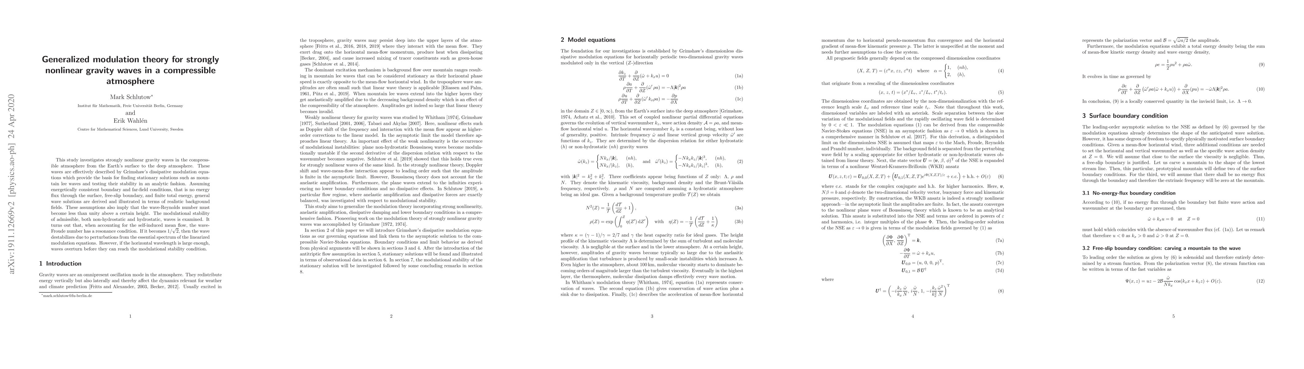 This paper develops a generalized modulation theory for nonlinear gravity waves in a compressible atmosphere, deriving stationary solutions and examining their stability. It finds that waves destabilize when the wave-Froude number reaches $1/\sqrt{2}$, but large horizontal wavelengths prevent this destabilization.