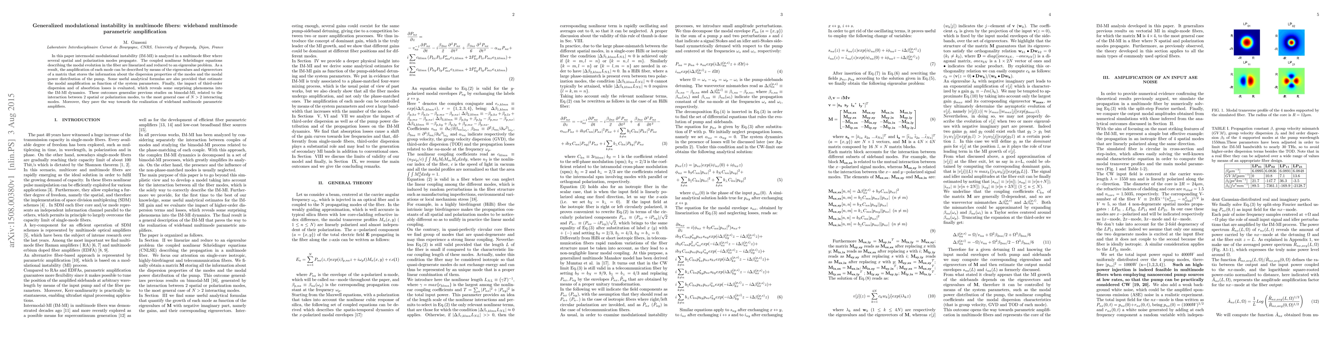 This paper investigates intermodal modulational instability in multimode fibers, deriving coupled nonlinear Schrödinger equations for modal evolution and reducing them to an eigenvalue problem. The study generalizes bimodal modulational instability to $N>2$ interacting modes, providing analytical formulas for modal amplification and revealing surprising dynamics influenced by third-order dispersion and absorption losses, paving the way for wideband multimode parametric amplifiers.