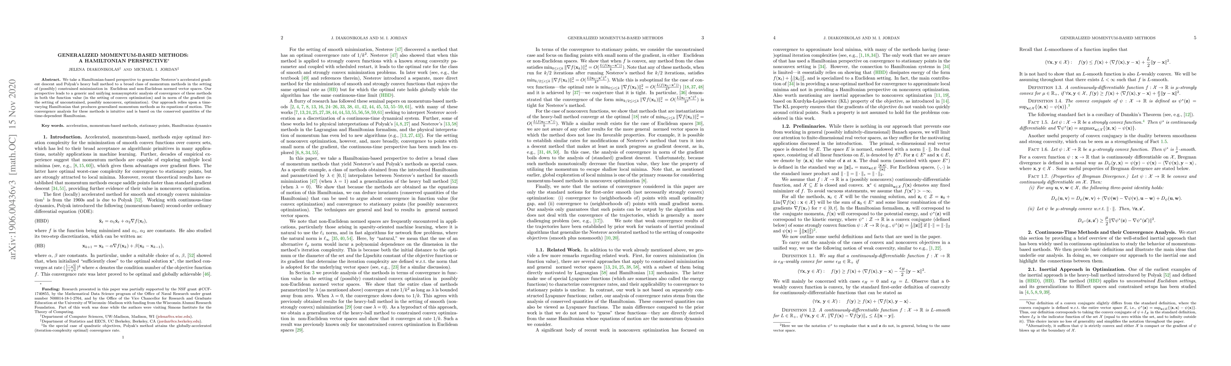 We take a Hamiltonian-based perspective to generalize Nesterov's accelerated gradient descent and Polyak's heavy ball method to a broad class of momentum methods in the setting of (possibly) constrained minimization in Euclidean and non-Euclidean normed vector spaces. Our perspective leads to a generic and unifying nonasymptotic analysis of convergence of these methods in both the function value (in the setting of convex optimization) and in norm of the gradient (in the setting of unconstrained, possibly nonconvex, optimization). Our approach relies upon a time-varying Hamiltonian that produces generalized momentum methods as its equations of motion. The convergence analysis for these methods is intuitive and is based on the conserved quantities of the time-dependent Hamiltonian.
