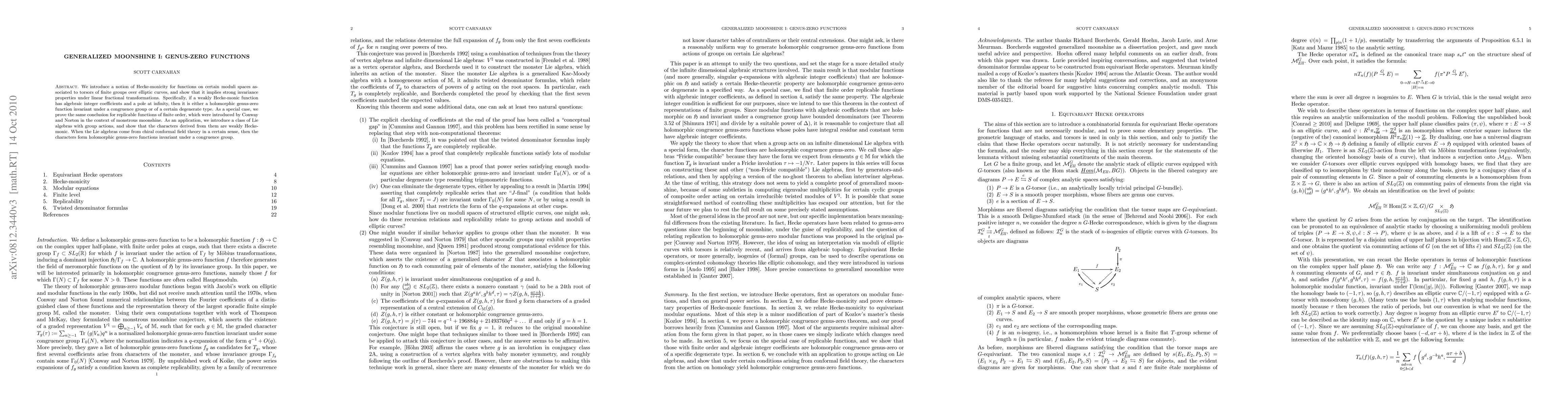 We introduce a notion of Hecke-monicity for functions on certain moduli spaces associated to torsors of finite groups over elliptic curves, and show that it implies strong invariance properties under linear fractional transformations. Specifically, if a weakly Hecke-monic function has algebraic integer coefficients and a pole at infinity, then it is either a holomorphic genus-zero function invariant under a congruence group or of a certain degenerate type. As a special case, we prove the same conclusion for replicable functions of finite order, which were introduced by Conway and Norton in the context of monstrous moonshine. As an application, we introduce a class of Lie algebras with group actions, and show that the characters derived from them are weakly Hecke-monic. When the Lie algebras come from chiral conformal field theory in a certain sense, then the characters form holomorphic genus-zero functions invariant under a congruence group.