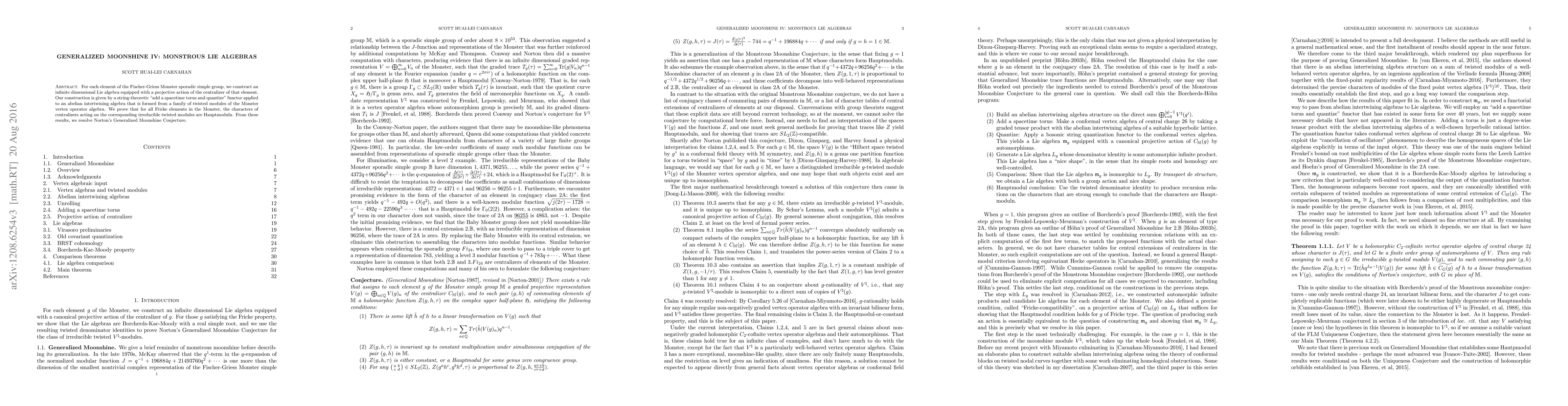 For each element of the Fischer-Griess Monster sporadic simple group, we construct an infinite dimensional Lie algebra equipped with a projective action of the centralizer of that element. Our construction is given by a string-theoretic "add a spacetime torus and quantize" functor applied to an abelian intertwining algebra that is formed from a family of twisted modules of the Monster vertex operator algebra. We prove that for all Fricke elements in the Monster, the characters of centralizers acting on the corresponding irreducible twisted modules are Hauptmoduln. From these results, we resolve Norton's Generalized Moonshine Conjecture.