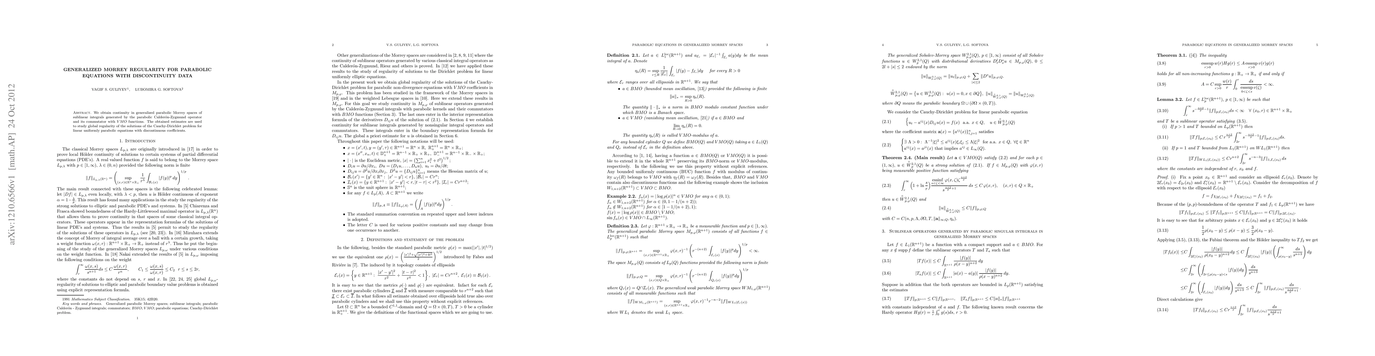 We obtain continuity in generalized parabolic Morrey spaces of sublinear integrals generated by the parabolic Calder\'{o}n-Zygmund operators and its commutator with $VMO$ functions. The obtained estimates are used to study global regularity of the solutions of the Cauchy-Dirichlet problem for linear uniformly parabolic equations with discontinuous coefficients.