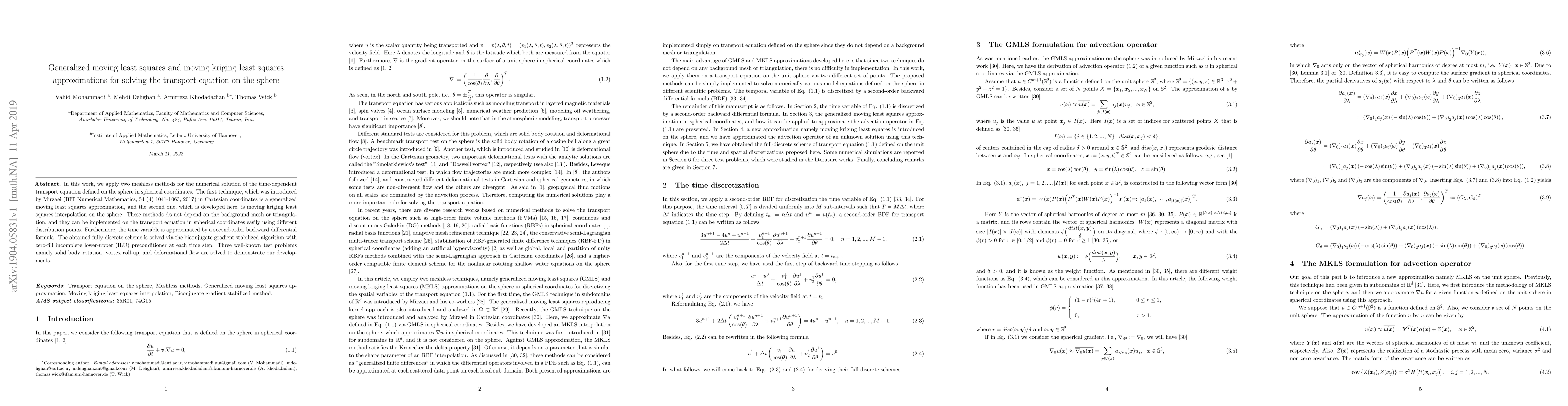 This paper introduces generalized moving least squares and moving kriging least squares methods for solving the transport equation on a sphere, employing meshless techniques without reliance on background mesh. The methods are demonstrated through solving three test problems: solid body rotation, vortex roll-up, and deformational flow.
