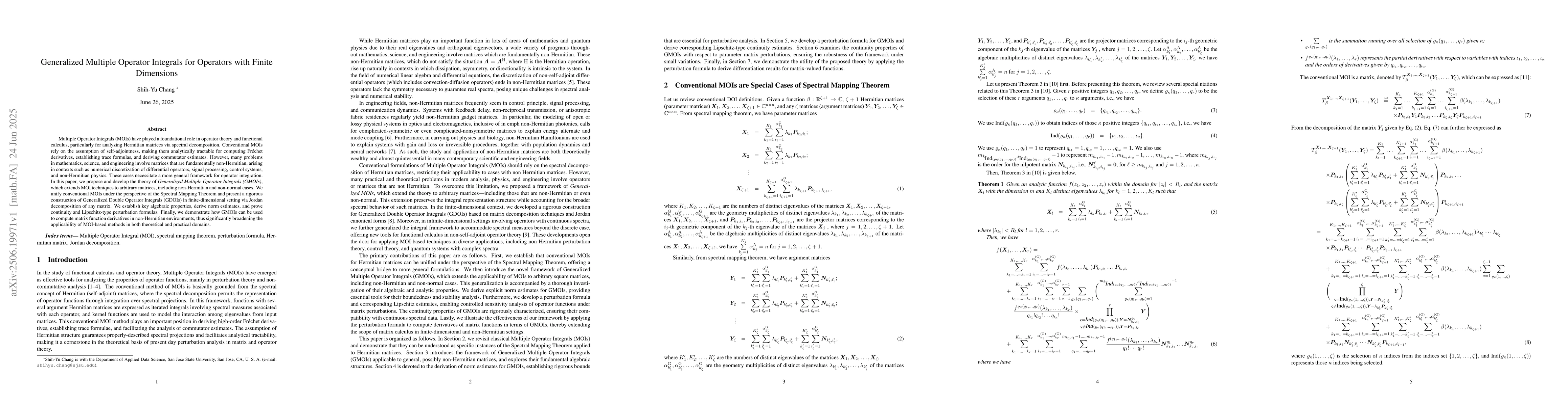 Multiple Operator Integrals (MOIs) have played a foundational role in operator theory and functional calculus, particularly for analyzing Hermitian matrices via spectral decomposition. Conventional MOIs rely on the assumption of self-adjointness, making them analytically tractable for computing Frechet derivatives, establishing trace formulas, and deriving commutator estimates. However, many problems in mathematics, science, and engineering involve matrices that are fundamentally non-Hermitian, arising in contexts such as numerical discretization of differential operators, signal processing, control systems, and non-Hermitian physics. These cases necessitate a more general framework for operator integration. In this paper, we propose and develop the theory of Generalized Multiple Operator Integrals (GMOIs), which extends MOI techniques to arbitrary matrices, including non-Hermitian and non-normal cases. We unify conventional MOIs under the perspective of the Spectral Mapping Theorem and present a rigorous construction of Generalized Double Operator Integrals (GDOIs) in finite-dimensional setting via Jordan decomposition of any matrix. We establish key algebraic properties, derive norm estimates, and prove continuity and Lipschitz-type perturbation formulas. Finally, we demonstrate how GMOIs can be used to compute matrix function derivatives in non-Hermitian environments, thus significantly broadening the applicability of MOI-based methods in both theoretical and practical domains.