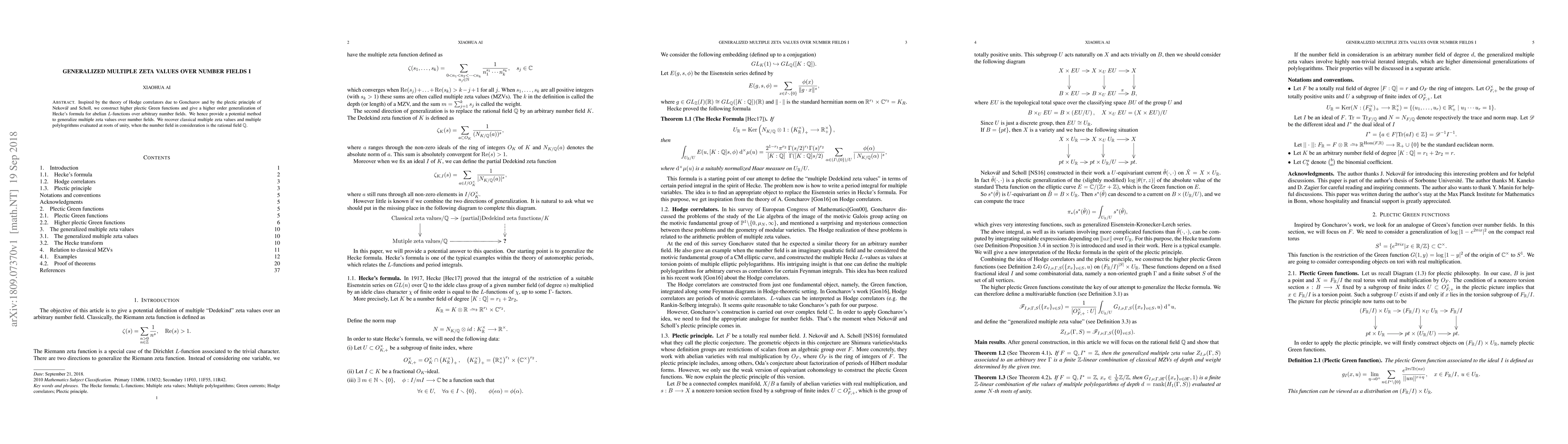 Inspired by the theory of Hodge correlators due to Goncharov and by the plectic principle of Nekov\'a\v{r} and Scholl, we construct higher plectic Green functions and give a higher order generalization of Hecke's formula for abelian $L$-functions over arbitrary number fields. We hence provide a potential method to generalize multiple zeta values over number fields. We recover classical multiple zeta values and multiple polylogrithms evaluated at roots of unity, when the number field in consideration is the rational field $\mathbb{Q}$.