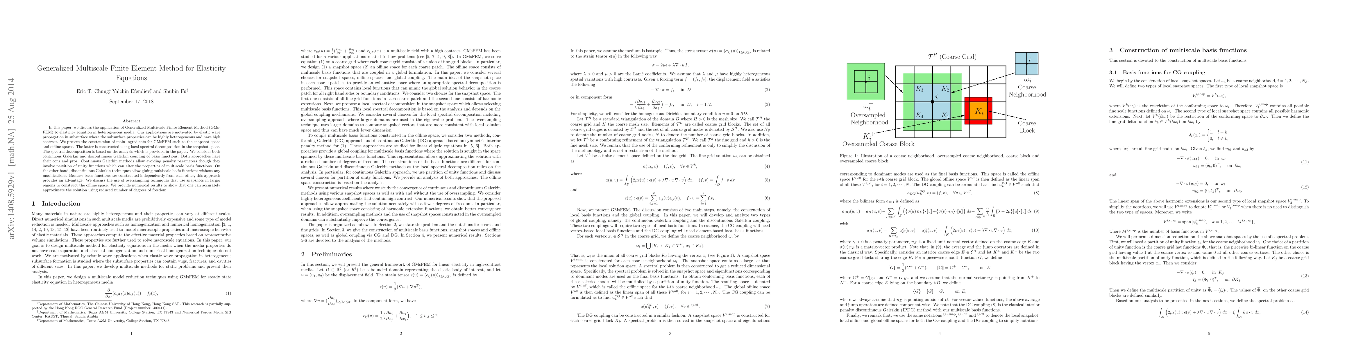 This paper applies the Generalized Multiscale Finite Element Method (GMsFEM) to solve elasticity equations in heterogeneous subsurface media, employing both continuous and discontinuous Galerkin methods. The study highlights the construction of snapshot and offline spaces, and demonstrates the effectiveness of oversampling techniques for accurate approximations with fewer degrees of freedom.