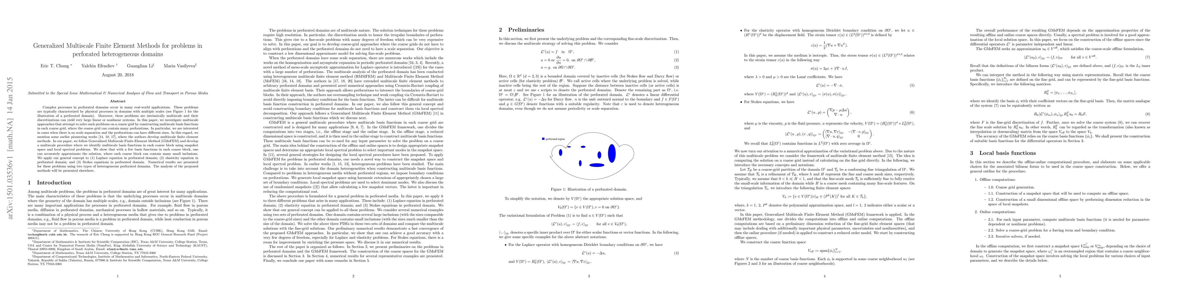 Complex processes in perforated domains occur in many real-world applications. These problems are typically characterized by physical processes in domains with multiple scales (see Figure 1 for the illustration of a perforated domain). Moreover, these problems are intrinsically multiscale and their discretizations can yield very large linear or nonlinear systems. In this paper, we investigate multiscale approaches that attempt to solve such problems on a coarse grid by constructing multiscale basis functions in each coarse grid, where the coarse grid can contain many perforations. In particular, we are interested in cases when there is no scale separation and the perforations can have different sizes. In this regard, we mention some earlier pioneering works [14, 18, 17], where the authors develop multiscale finite element methods. In our paper, we follow Generalized Multiscale Finite Element Method (GMsFEM) and develop a multiscale procedure where we identify multiscale basis functions in each coarse block using snapshot space and local spectral problems. We show that with a few basis functions in each coarse block, one can accurately approximate the solution, where each coarse block can contain many small inclusions. We apply our general concept to (1) Laplace equation in perforated domain; (2) elasticity equation in perforated domain; and (3) Stokes equations in perforated domain. Numerical results are presented for these problems using two types of heterogeneous perforated domains. The analysis of the proposed methods will be presented elsewhere.