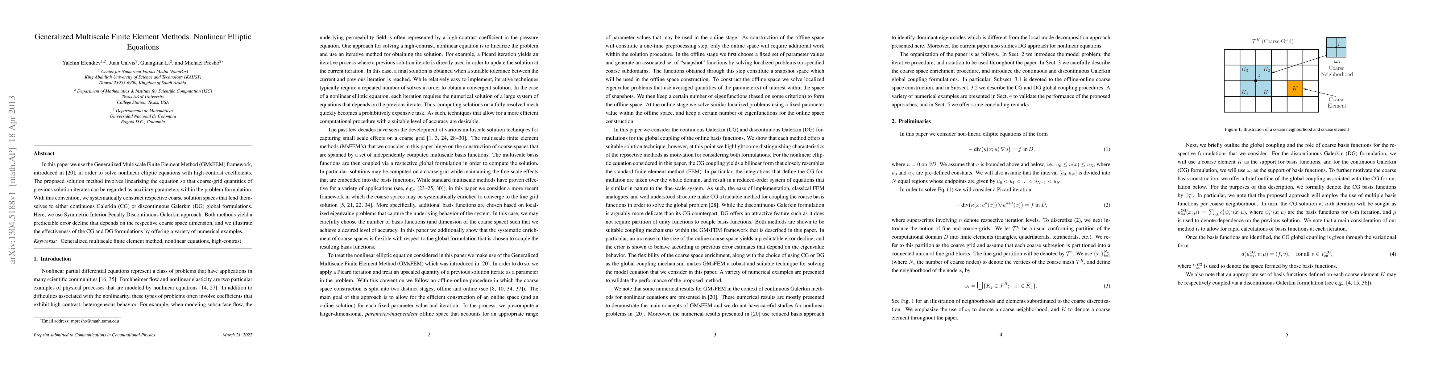 In this paper we use the GeneralizedMultiscale Finite ElementMethod (GMsFEM) framework, introduced in [20], in order to solve nonlinear elliptic equations with high-contrast coefficients. The proposed solution method involves linearizing the equation so that coarse-grid quantities of previous solution iterates can be regarded as auxiliary parameters within the problem formulation. With this convention, we systematically construct respective coarse solution spaces that lend themselves to either continuous Galerkin (CG) or discontinuous Galerkin (DG) global formulations. Here, we use Symmetric Interior Penalty Discontinuous Galerkin approach. Both methods yield a predictable error decline that depends on the respective coarse space dimension, and we illustrate the effectiveness of the CG and DG formulations by offering a variety of numerical examples.