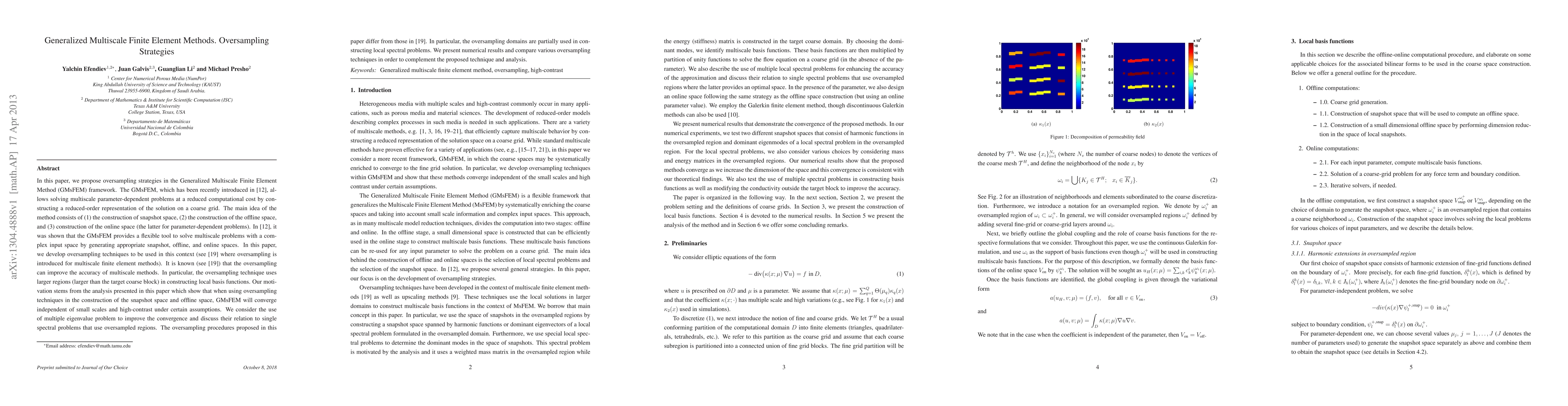 This paper proposes oversampling strategies within the Generalized Multiscale Finite Element Method (GMsFEM) framework to enhance accuracy and convergence. The authors develop new oversampling techniques that utilize larger regions in constructing local basis functions, showing improved convergence independent of small scales and high-contrast. Numerical results are presented to compare various oversampling methods.