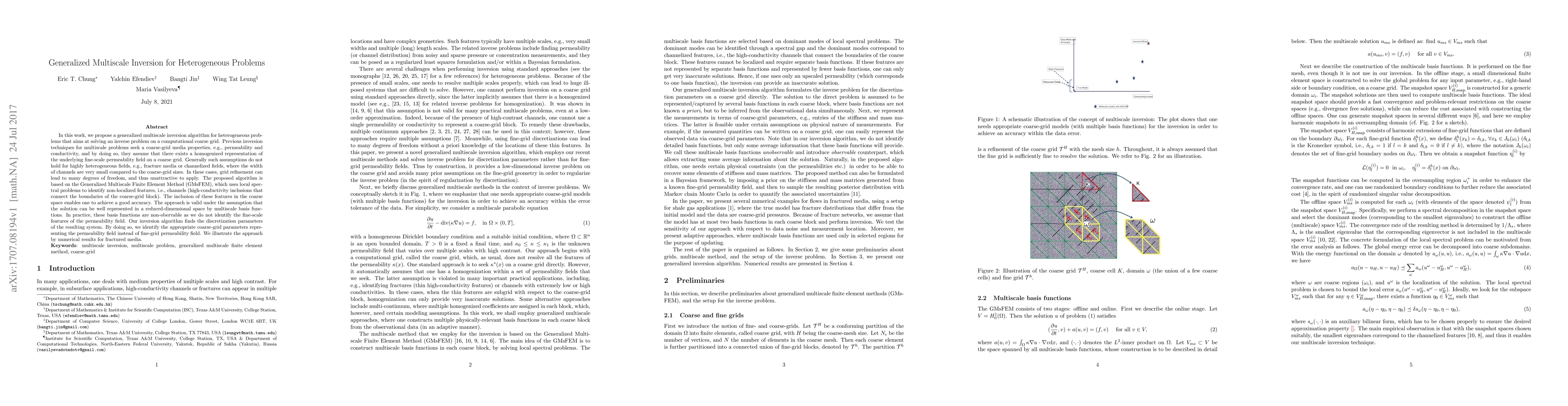 In this work, we propose a generalized multiscale inversion algorithm for heterogeneous problems that aims at solving an inverse problem on a computational coarse grid. Previous inversion techniques for multiscale problems seek a coarse-grid media properties, e.g., permeability and conductivity, and by doing so, they assume that there exists a homogenized representation of the underlying fine-scale permeability field on a coarse grid. Generally such assumptions do not hold for highly heterogeneous fields, e.g., fracture media or channelized fields, where the width of channels are very small compared to the coarse-grid sizes. In these cases, grid refinement can lead to many degrees of freedom, and thus unattractive to apply. The proposed algorithm is based on the Generalized Multiscale Finite Element Method (GMsFEM), which uses local spectral problems to identify non-localized features, i.e., channels (high-conductivity inclusions that connect the boundaries of the coarse-grid block). The inclusion of these features in the coarse space enables one to achieve a good accuracy. The approach is valid under the assumption that the solution can be well represented in a reduced-dimensional space by multiscale basis functions. In practice, these basis functions are non-observable as we do not identify the fine-scale features of the permeability field. Our inversion algorithm finds the discretization parameters of the resulting system. By doing so, we identify the appropriate coarse-grid parameters representing the permeability field instead of fine-grid permeability field. We illustrate the approach by numerical results for fractured media.