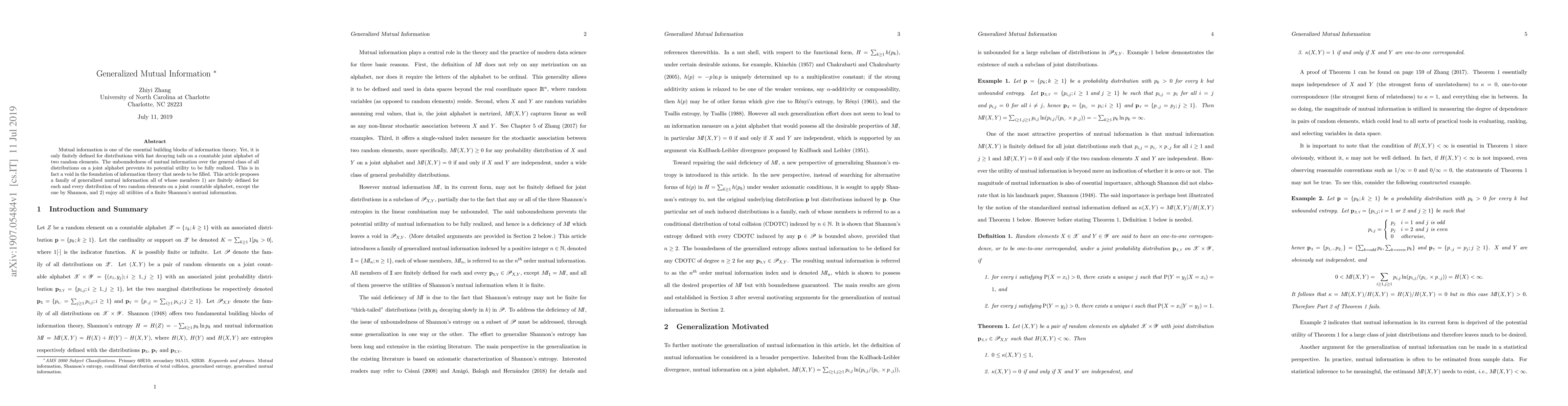 Mutual information is one of the essential building blocks of information theory. Yet, it is only finitely defined for distributions with fast decaying tails on a countable joint alphabet of two random elements. The unboundedness of mutual information over the general class of all distributions on a joint alphabet prevents its potential utility to be fully realized. This is in fact a void in the foundation of information theory that needs to be filled. This article proposes a family of generalized mutual information all of whose members 1) are finitely defined for each and every distribution of two random elements on a joint countable alphabet, except the one by Shannon, and 2) enjoy all utilities of a finite Shannon's mutual information.