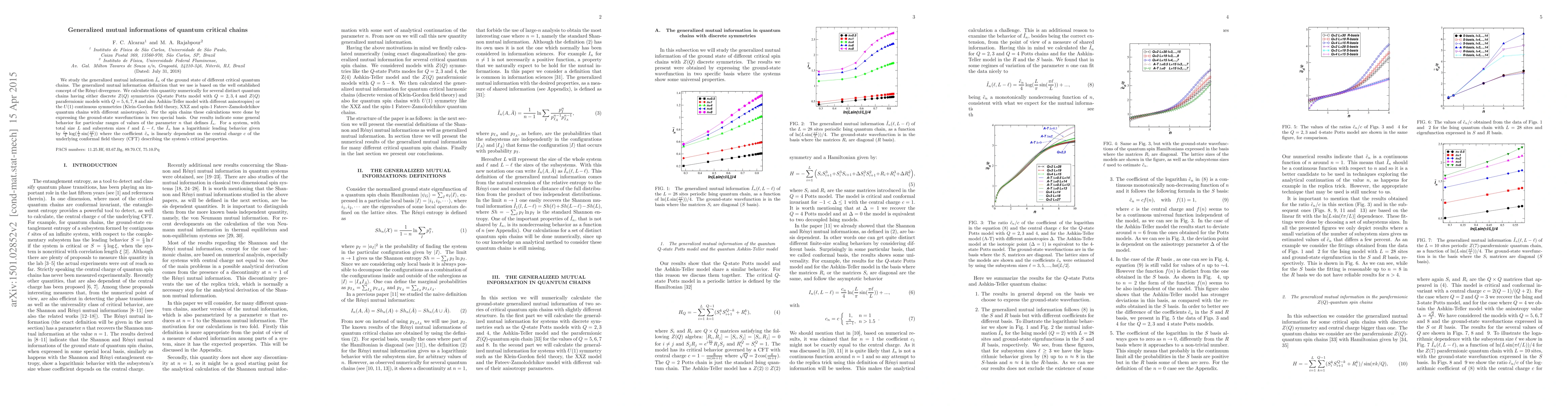This paper numerically investigates the generalized R\'enyi mutual information $\tilde{I}_n$ in various quantum critical chains, revealing a logarithmic scaling behavior dependent on the system size and subsystem sizes, with the coefficient $\tilde{c}_n$ linked to the central charge of the underlying conformal field theory.