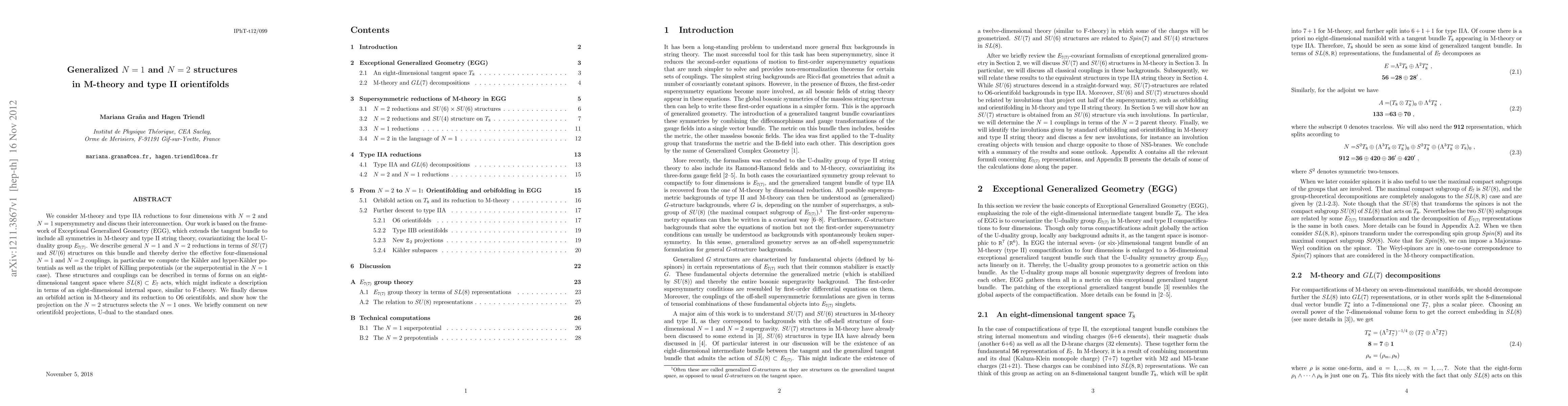 We consider M-theory and type IIA reductions to four dimensions with N=2 and N=1 supersymmetry and discuss their interconnection. Our work is based on the framework of Exceptional Generalized Geometry (EGG), which extends the tangent bundle to include all symmetries in M-theory and type II string theory, covariantizing the local U-duality group E7. We describe general N=1 and N=2 reductions in terms of SU(7) and SU(6) structures on this bundle and thereby derive the effective four-dimensional N=1 and N=2 couplings, in particular we compute the Kahler and hyper-Kahler potentials as well as the triplet of Killing prepotentials (or the superpotential in the N=1 case). These structures and couplings can be described in terms of forms on an eight-dimensional tangent space where SL(8) contained in E7 acts, which might indicate a description in terms of an eight-dimensional internal space, similar to F-theory. We finally discuss an orbifold action in M-theory and its reduction to O6 orientifolds, and show how the projection on the N=2 structures selects the N=1 ones. We briefly comment on new orientifold projections, U-dual to the standard ones.
