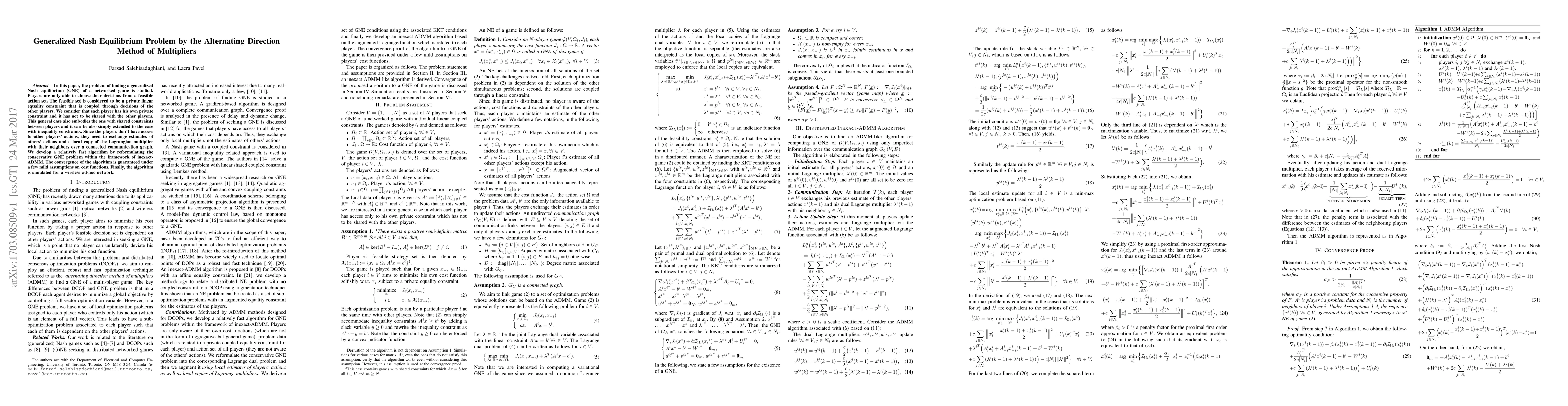 In this paper, the problem of finding a generalized Nash equilibrium (GNE) of a networked game is studied. Players are only able to choose their decisions from a feasible action set. The feasible set is considered to be a private linear equality constraint that is coupled through decisions of the other players. We consider that each player has his own private constraint and it has not to be shared with the other players. This general case also embodies the one with shared constraints between players and it can be also simply extended to the case with inequality constraints. Since the players don't have access to other players' actions, they need to exchange estimates of others' actions and a local copy of the Lagrangian multiplier with their neighbors over a connected communication graph. We develop a relatively fast algorithm by reformulating the conservative GNE problem within the framework of inexact-ADMM. The convergence of the algorithm is guaranteed under a few mild assumptions on cost functions. Finally, the algorithm is simulated for a wireless ad-hoc network.