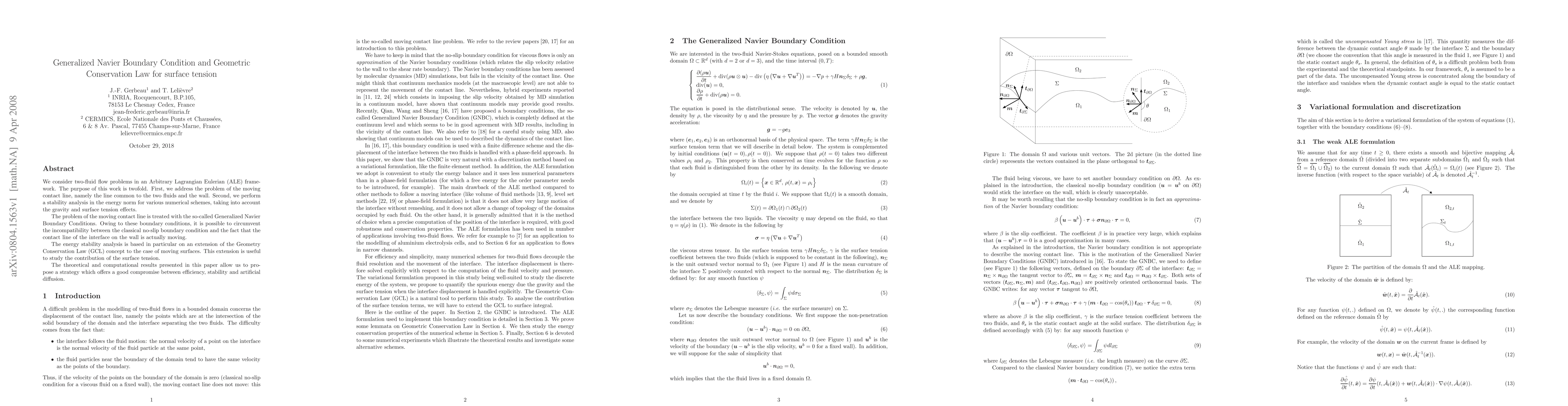 This paper addresses two-fluid flow problems using an Arbitrary Lagrangian Eulerian framework, focusing on the moving contact line and numerical stability. It proposes Generalized Navier Boundary Conditions to reconcile the no-slip boundary condition with a moving interface, and extends the Geometry Conservation Law for energy stability analysis considering surface tension effects.
