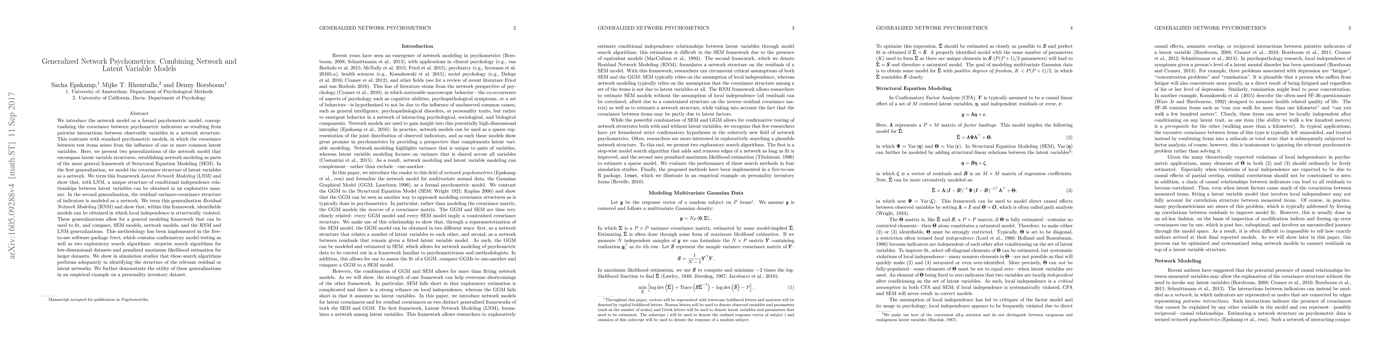 We introduce the network model as a formal psychometric model, conceptualizing the covariance between psychometric indicators as resulting from pairwise interactions between observable variables in a network structure. This contrasts with standard psychometric models, in which the covariance between test items arises from the influence of one or more common latent variables. Here, we present two generalizations of the network model that encompass latent variable structures, establishing network modeling as parts of the more general framework of Structural Equation Modeling (SEM). In the first generalization, we model the covariance structure of latent variables as a network. We term this framework Latent Network Modeling (LNM) and show that, with LNM, a unique structure of conditional independence relationships between latent variables can be obtained in an explorative manner. In the second generalization, the residual variance-covariance structure of indicators is modeled as a network. We term this generalization Residual Network Modeling (RNM) and show that, within this framework, identifiable models can be obtained in which local independence is structurally violated. These generalizations allow for a general modeling framework that can be used to fit, and compare, SEM models, network models, and the RNM and LNM generalizations. This methodology has been implemented in the free-to-use software package lvnet, which contains confirmatory model testing as well as two exploratory search algorithms: stepwise search algorithms for low-dimensional datasets and penalized maximum likelihood estimation for larger datasets. We show in simulation studies that these search algorithms performs adequately in identifying the structure of the relevant residual or latent networks. We further demonstrate the utility of these generalizations in an empirical example on a personality inventory dataset.