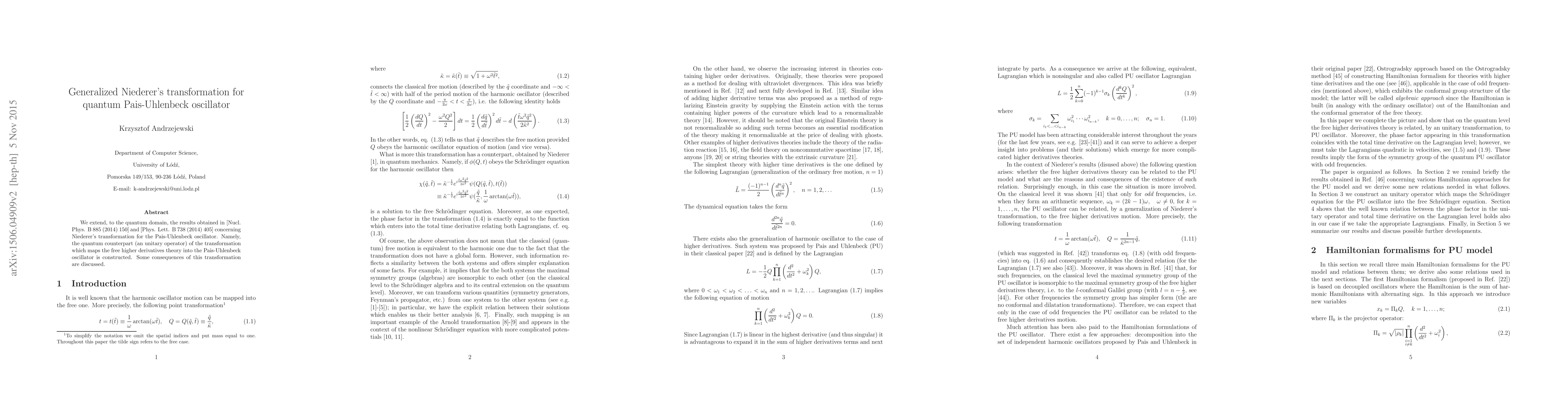 This paper constructs the quantum counterpart of Niederer's transformation, mapping a free higher derivatives theory to the quantum Pais-Uhlenbeck oscillator. The study discusses the consequences of this transformation in the quantum domain.