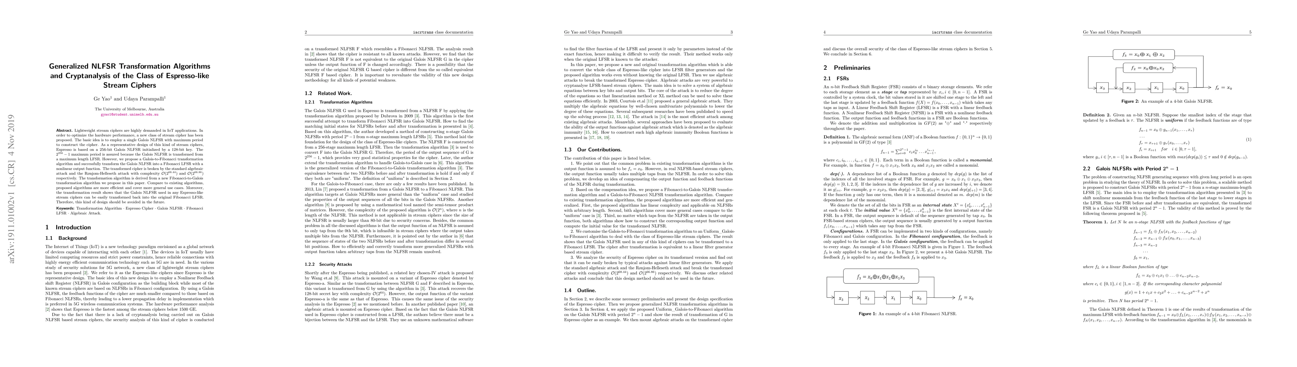 This paper proposes generalized NLFSR transformation algorithms to analyze a new class of lightweight stream ciphers, specifically Espresso-like designs. The authors demonstrate that transforming a Galois NLFSR into a Fibonacci LFSR with a nonlinear output function can be broken using algebraic and Rønjom-Helleseth attacks, suggesting that such designs should be avoided for future IoT applications.