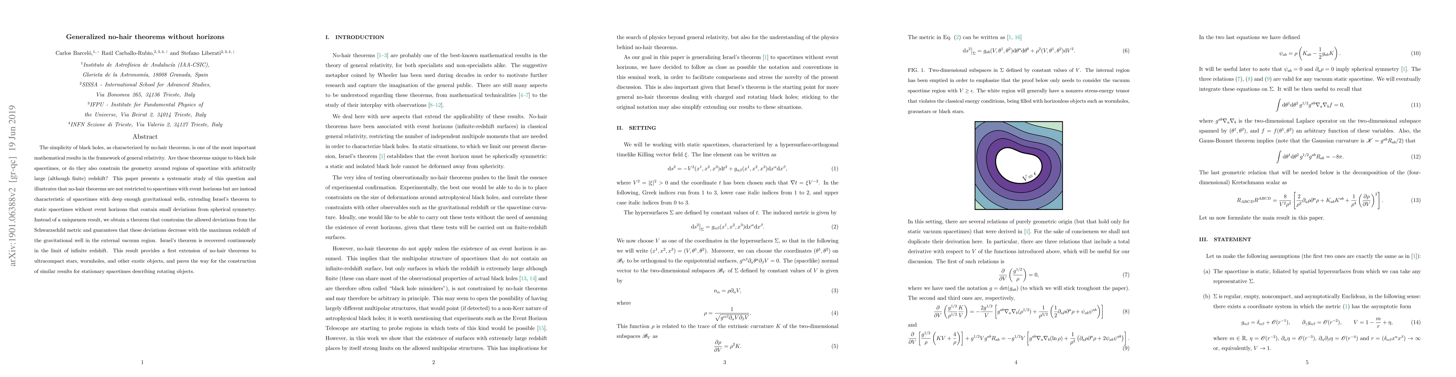 This paper extends no-hair theorems to static spacetimes without event horizons, showing that these theorems apply to regions with deep gravitational wells, constraining deviations from spherical symmetry and decreasing with maximum redshift. This generalizes Israel's theorem to include ultracompact stars, wormholes, and other exotic objects.