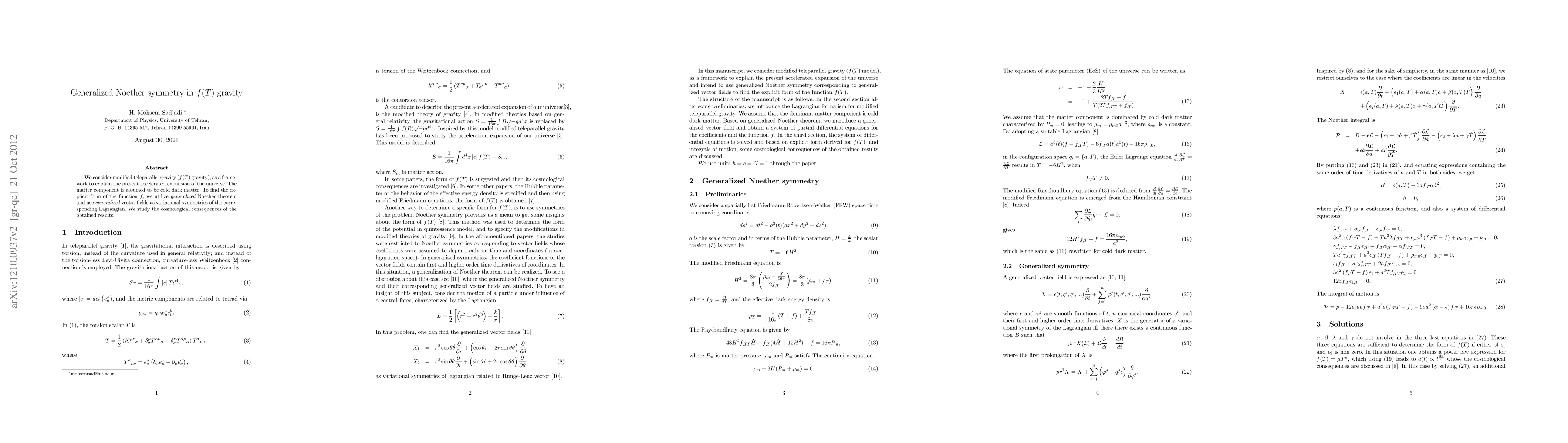 The research employs generalized Noether symmetry in the context of f(T) gravity, a modified teleparallel gravity model, to determine the explicit form of the function f(T) for explaining the universe's accelerated expansion, assuming cold dark matter as the matter component.