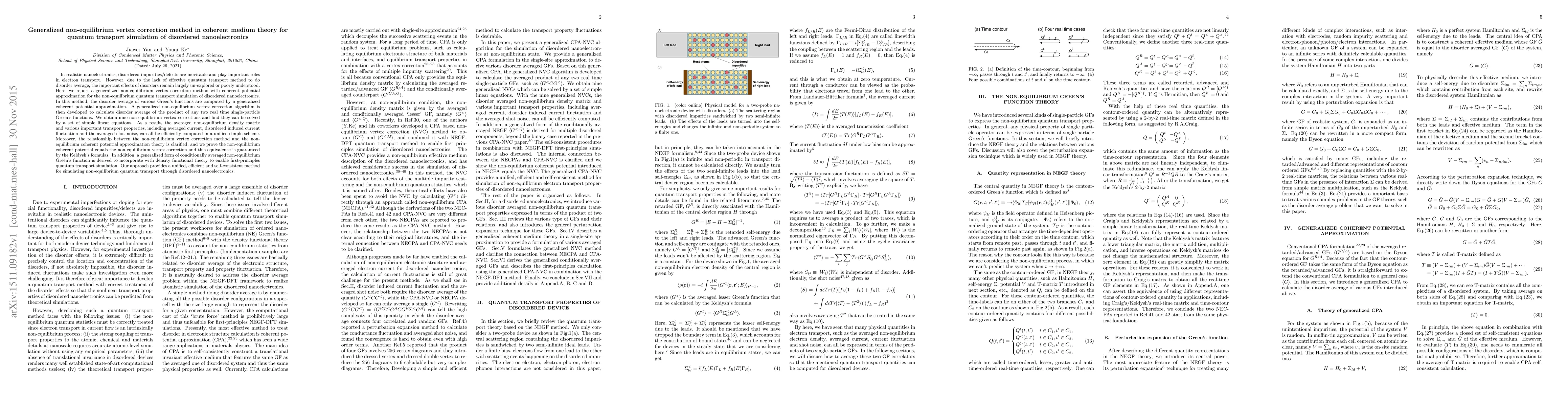 This paper introduces a generalized non-equilibrium vertex correction method for simulating quantum transport in disordered nanoelectronics, employing a coherent potential approximation to average disorder effects. The method efficiently computes transport properties like current and shot noise, establishing a relationship with the non-equilibrium coherent potential approximation and enabling first-principles simulations.