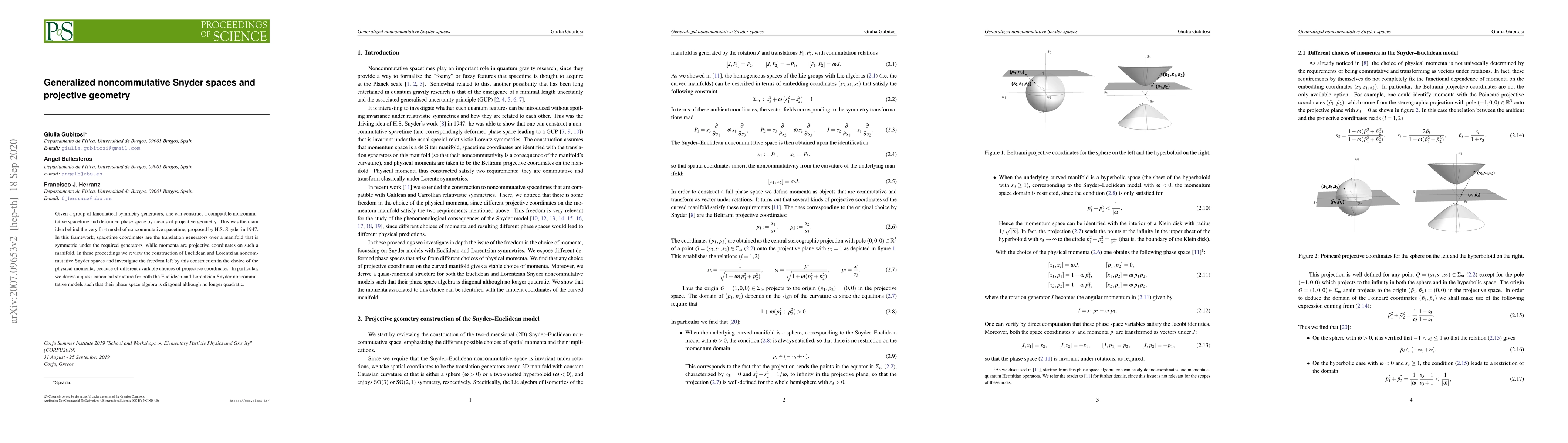 This paper reviews the construction of generalized noncommutative Snyder spaces using projective geometry, focusing on both Euclidean and Lorentzian models. It explores the flexibility in choosing physical momenta through various projective coordinates, deriving a quasi-canonical structure for both models where their phase space algebra remains diagonal but non-quadratic.