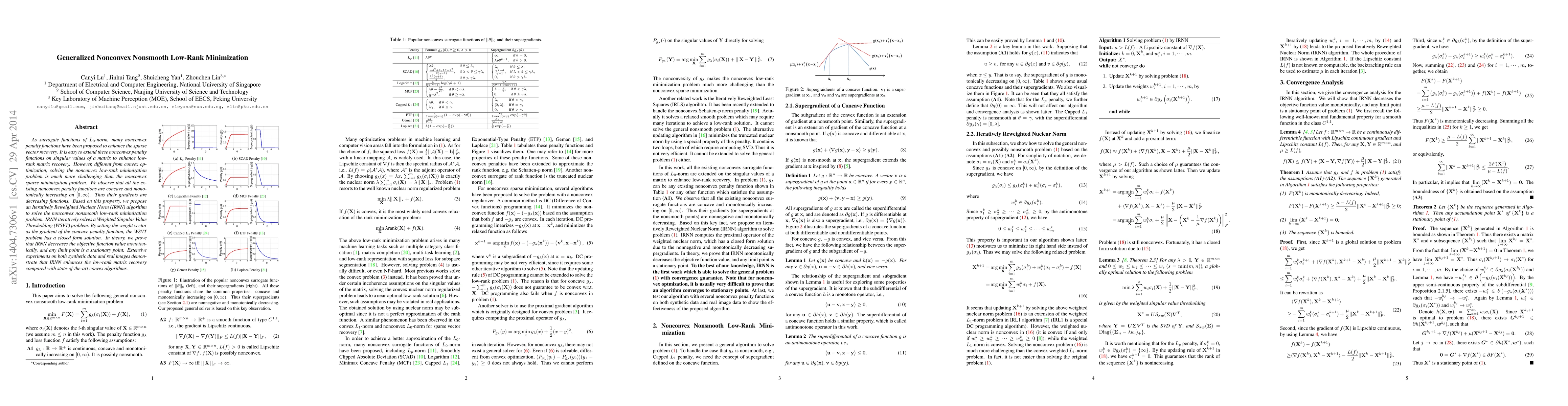 This paper proposes an Iteratively Reweighted Nuclear Norm (IRNN) algorithm to solve nonconvex nonsmooth low-rank minimization problems, leveraging the concavity and monotonicity of existing nonconvex penalty functions. The IRNN algorithm iteratively solves a Weighted Singular Value Thresholding problem, demonstrating enhanced low-rank matrix recovery compared to state-of-the-art convex methods.