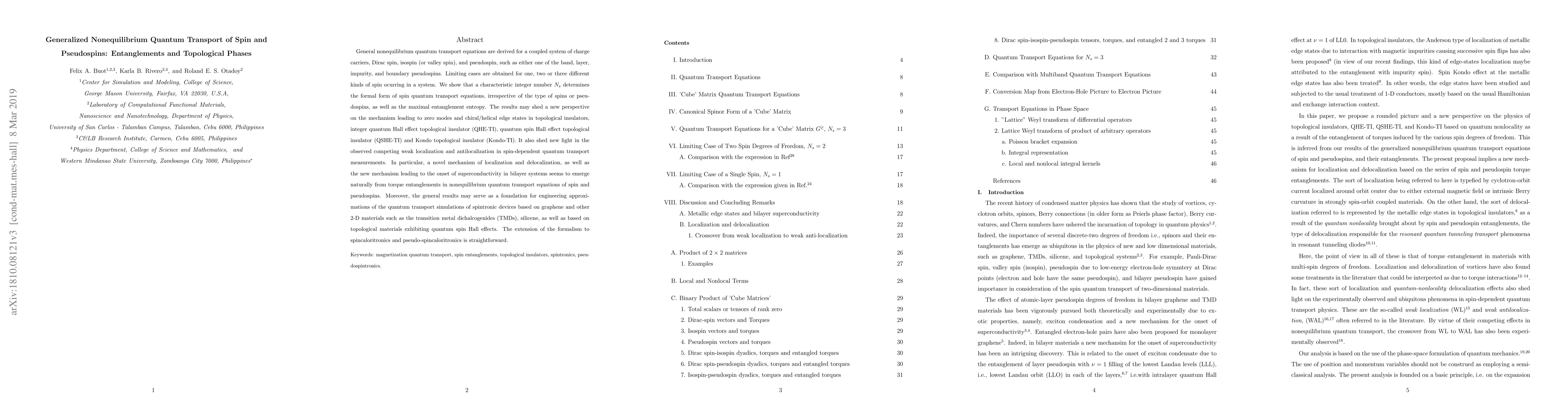 This paper derives general nonequilibrium quantum transport equations for coupled charge carriers and various spin and pseudospin types, revealing a characteristic integer $N_{s}$ that governs the transport equations and maximal entanglement entropy. The findings provide new insights into topological phases, zero modes, and superconductivity mechanisms in topological insulators, and may guide the engineering of spintronic devices based on graphene and other 2D materials.