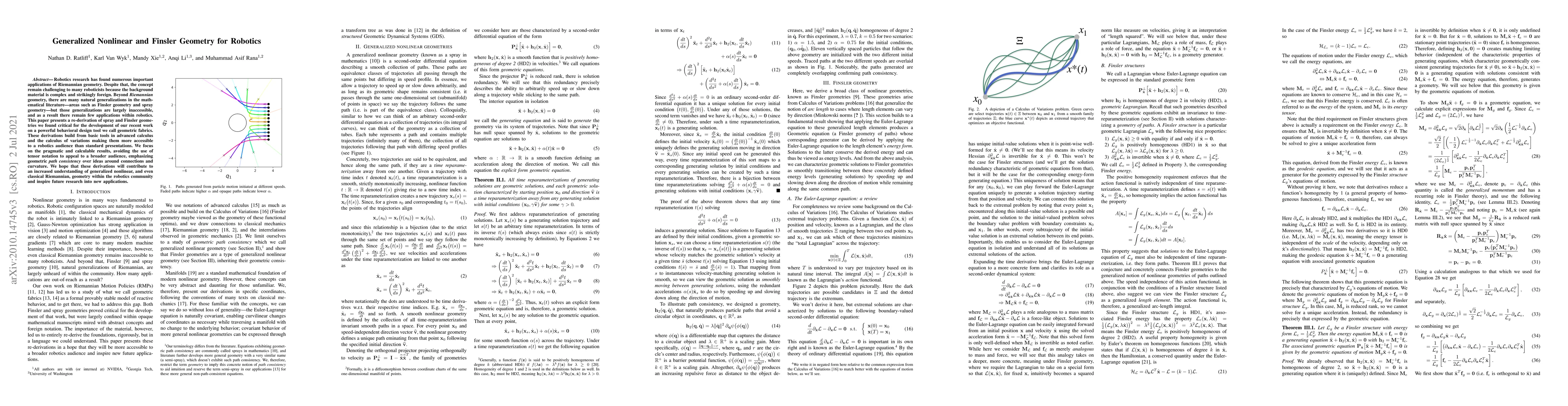 Robotics research has found numerous important applications of Riemannian geometry. Despite that, the concept remain challenging to many roboticists because the background material is complex and strikingly foreign. Beyond {\em Riemannian} geometry, there are many natural generalizations in the mathematical literature -- areas such as Finsler geometry and spray geometry -- but those generalizations are largely inaccessible, and as a result there remain few applications within robotics. This paper presents a re-derivation of spray and Finsler geometries we found critical for the development of our recent work on a powerful behavioral design tool we call geometric fabrics. These derivations build from basic tools in advanced calculus and the calculus of variations making them more accessible to a robotics audience than standard presentations. We focus on the pragmatic and calculable results, avoiding the use of tensor notation to appeal to a broader audience, emphasizing geometric path consistency over ideas around connections and curvature. We hope that these derivations will contribute to an increased understanding of generalized nonlinear, and even classical Riemannian, geometry within the robotics community and inspire future research into new applications.