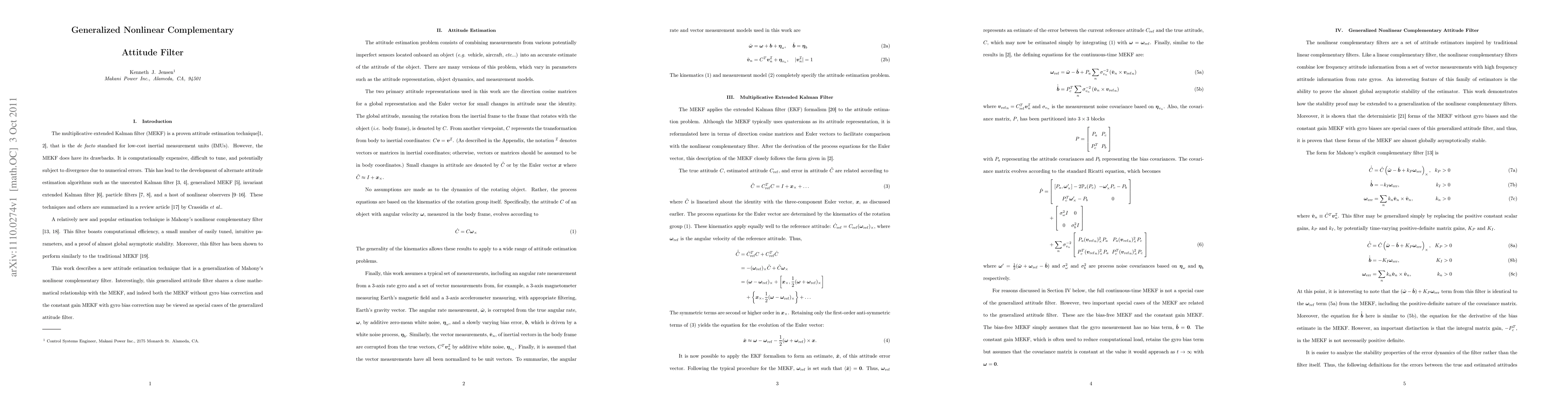 This paper presents a generalized nonlinear complementary attitude filter, revealing its connection to the multiplicative extended Kalman filter, and provides a method for selecting gains and proving stability for special cases.