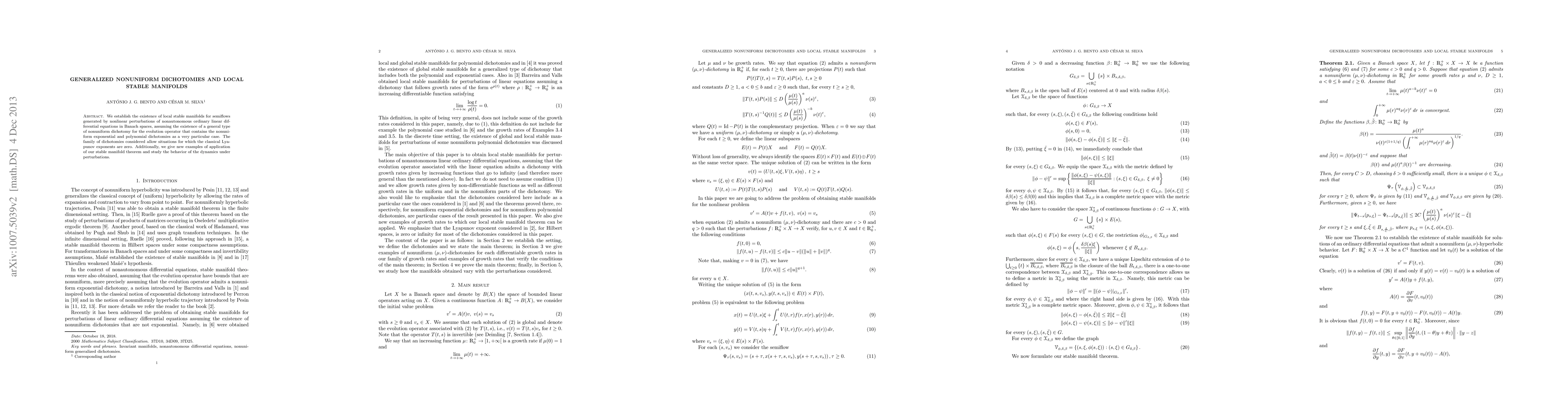 This paper establishes the existence of local stable manifolds for semiflows generated by nonlinear perturbations of nonautonomous ordinary differential equations, assuming a generalized nonuniform dichotomy for the evolution operator. It also explores the dynamics under perturbations and provides new applications of the stable manifold theorem.