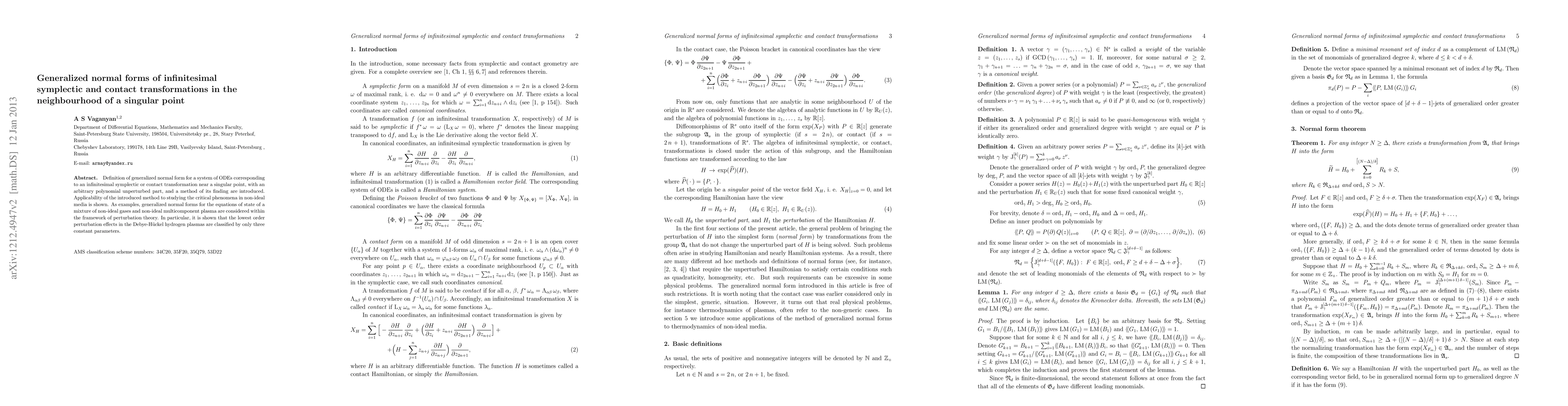 Definition of generalized normal form for a system of ODEs corresponding to an infinitesimal symplectic or contact transformation near a singular point, with an arbitrary polynomial unperturbed part, and a method of its finding are introduced. Applicability of the introduced method to studying the critical phenomena in non-ideal media is shown. As examples, generalized normal forms for the equations of state of a mixture of non-ideal gases and non-ideal multicomponent plasma are considered within the framework of perturbation theory. In particular, it is shown that the lowest order perturbation effects in the Debye-H\"uckel hydrogen plasmas are classified by only three constant parameters.