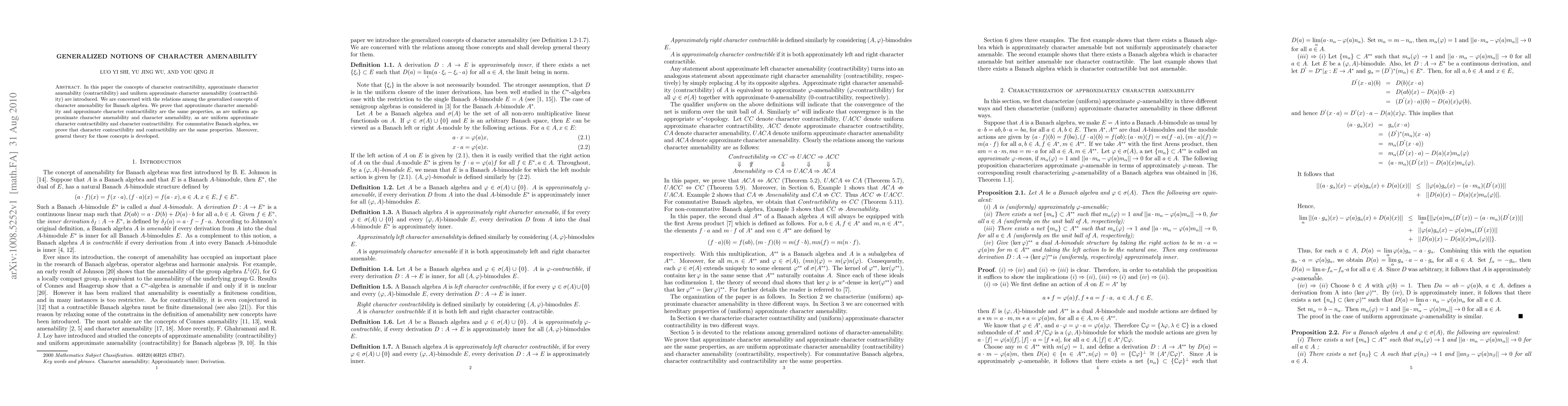 In this paper the concepts of character contractibility, approximate character amenability (contractibility) and uniform approximate character amenability (contractibility) are introduced. We are concerned with the relations among the generalized concepts of character amenability for Banach algebra. We prove that approximate character amenability and approximate character contractibility are the same properties, as are uniform approximate character amenability and character amenability, as are uniform approximate character contractibility and character contractibility. For commutative Banach algebra, we prove that character contractibility and contractibility are the same properties. Moreover, general theory for those concepts is developed.