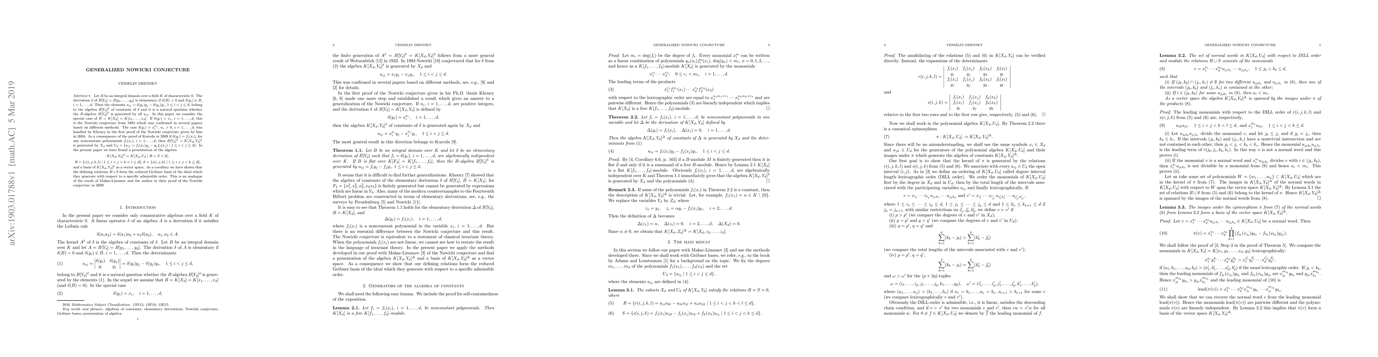 This paper explores the Generalized Nowicki conjecture for derivations in polynomial rings over a field of characteristic 0. It establishes a presentation and basis for the algebra of constants under specific derivations, and proves that the defining relations form a reduced Gröbner basis, extending previous results on the Nowicki conjecture.