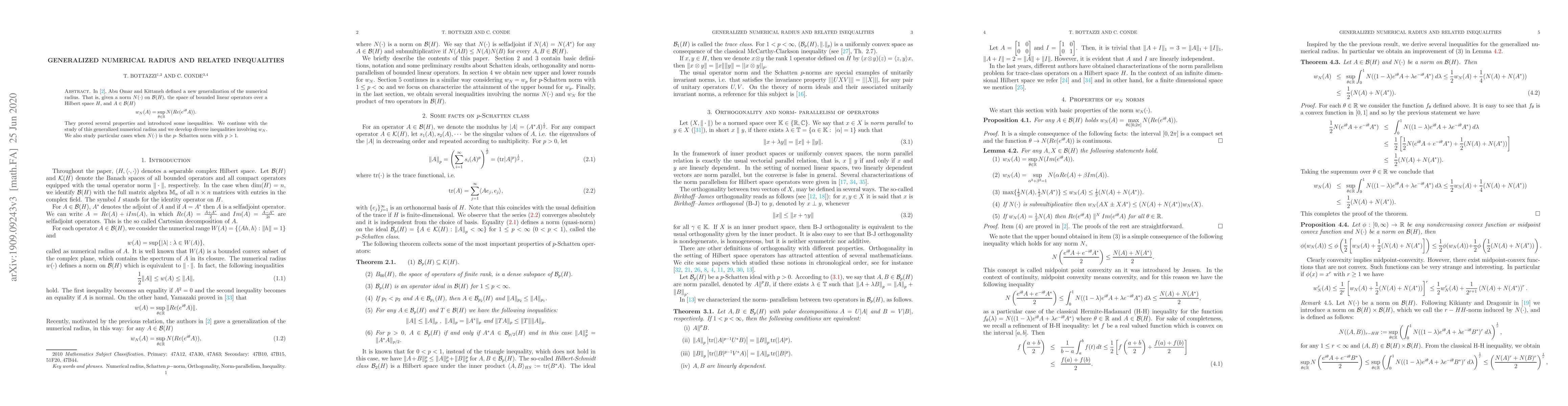 This paper explores the generalized numerical radius $w_N$ defined for a given norm $N$ on bounded linear operators over a Hilbert space, and develops various inequalities involving $w_N$. It also examines specific cases, such as the p-Schatten norms for $p > 1$.