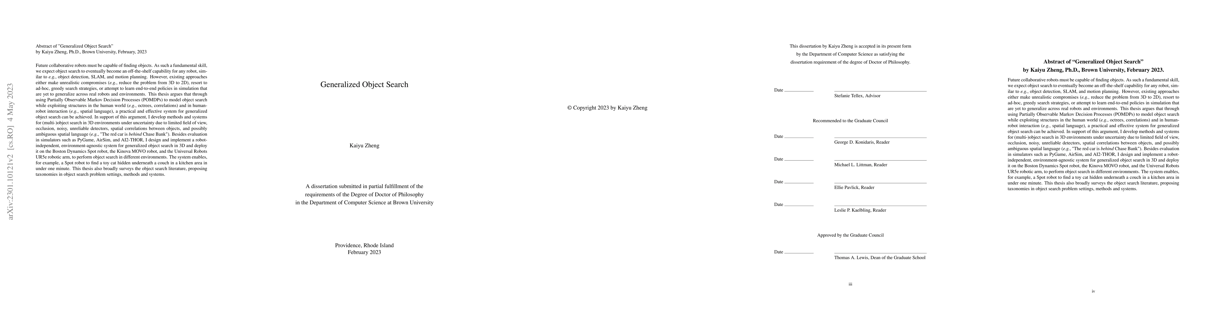 Future collaborative robots must be capable of finding objects. As such a fundamental skill, we expect object search to eventually become an off-the-shelf capability for any robot, similar to e.g., object detection, SLAM, and motion planning. However, existing approaches either make unrealistic compromises (e.g., reduce the problem from 3D to 2D), resort to ad-hoc, greedy search strategies, or attempt to learn end-to-end policies in simulation that are yet to generalize across real robots and environments. This thesis argues that through using Partially Observable Markov Decision Processes (POMDPs) to model object search while exploiting structures in the human world (e.g., octrees, correlations) and in human-robot interaction (e.g., spatial language), a practical and effective system for generalized object search can be achieved. In support of this argument, I develop methods and systems for (multi-)object search in 3D environments under uncertainty due to limited field of view, occlusion, noisy, unreliable detectors, spatial correlations between objects, and possibly ambiguous spatial language (e.g., "The red car is behind Chase Bank"). Besides evaluation in simulators such as PyGame, AirSim, and AI2-THOR, I design and implement a robot-independent, environment-agnostic system for generalized object search in 3D and deploy it on the Boston Dynamics Spot robot, the Kinova MOVO robot, and the Universal Robots UR5e robotic arm, to perform object search in different environments. The system enables, for example, a Spot robot to find a toy cat hidden underneath a couch in a kitchen area in under one minute. This thesis also broadly surveys the object search literature, proposing taxonomies in object search problem settings, methods and systems.