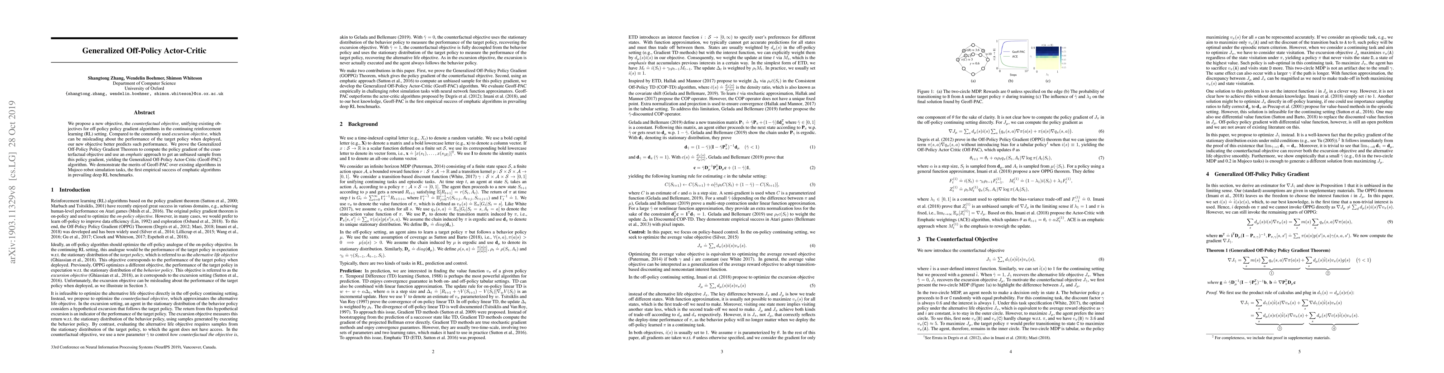 This paper introduces the counterfactual objective to unify existing off-policy policy gradient algorithms in continuing reinforcement learning, proving the Generalized Off-Policy Policy Gradient Theorem. The proposed Generalized Off-Policy Actor-Critic (Geoff-PAC) algorithm outperforms existing methods, as demonstrated in Mujoco robot simulations.