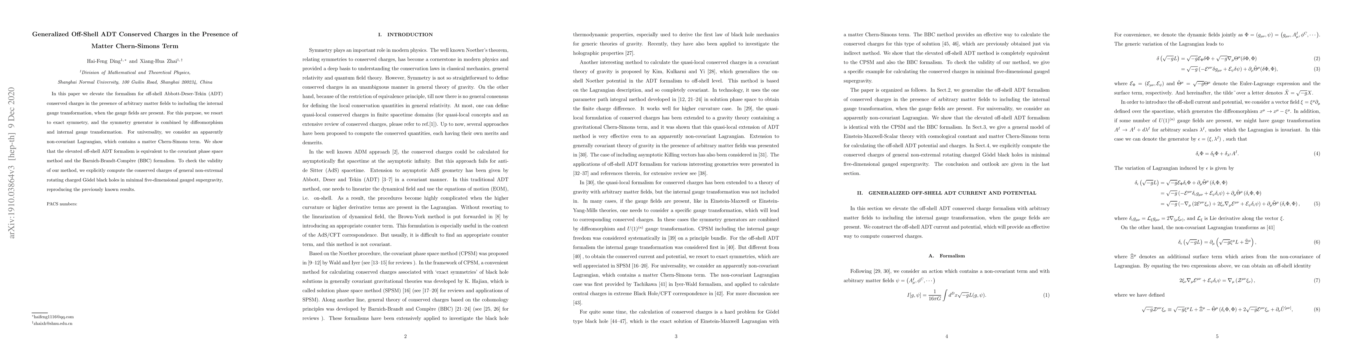 In this paper we elevate the formalism for off-shell Abbott-Deser-Tekin (ADT) conserved charges in the presence of arbitrary matter fields to including the internal gauge transformation, when the gauge fields are present. For this purpose, we resort to exact symmetry, and the symmetry generator is combined by diffeomorphism and internal gauge transformation. For universality, we consider an apparently non-covariant Lagrangian, which contains a matter Chern-Simons term. We show that the elevated off-shell ADT formalism is equivalent to the covariant phase space method and the Barnich-Brandt-Comp\`ere (BBC) formalism. To check the validity of our method, we explicitly compute the conserved charges of general non-extremal rotating charged G\"odel black holes in minimal five-dimensional gauged supergravity, reproducing the previously known results.