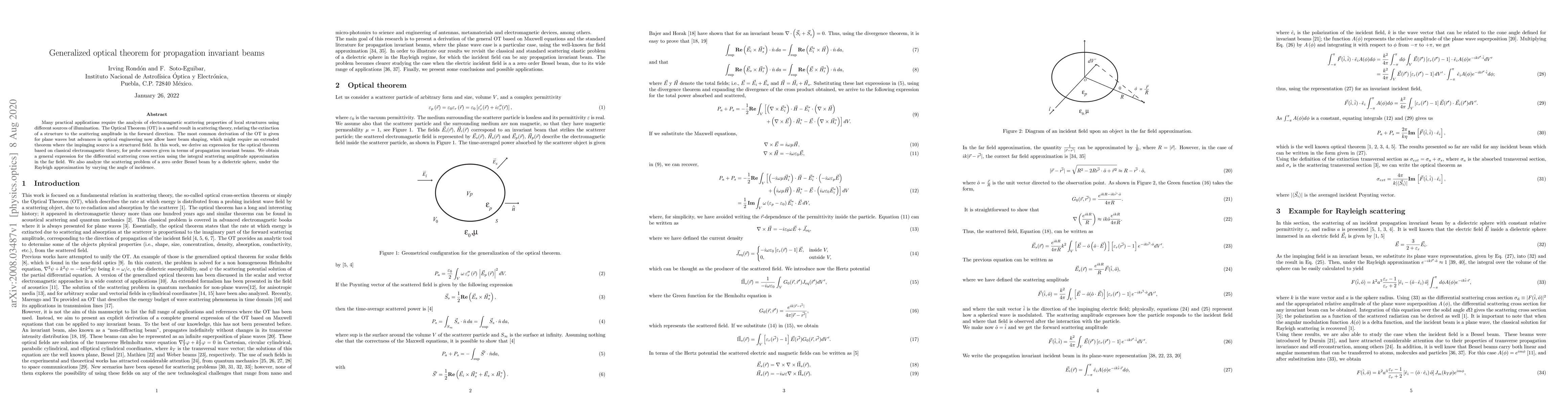 This paper derives a generalized optical theorem for structured fields, specifically propagation invariant beams, extending the traditional optical theorem for plane waves. The study also applies this theorem to analyze scattering from a dielectric sphere by a zero-order Bessel beam, varying the angle of incidence.