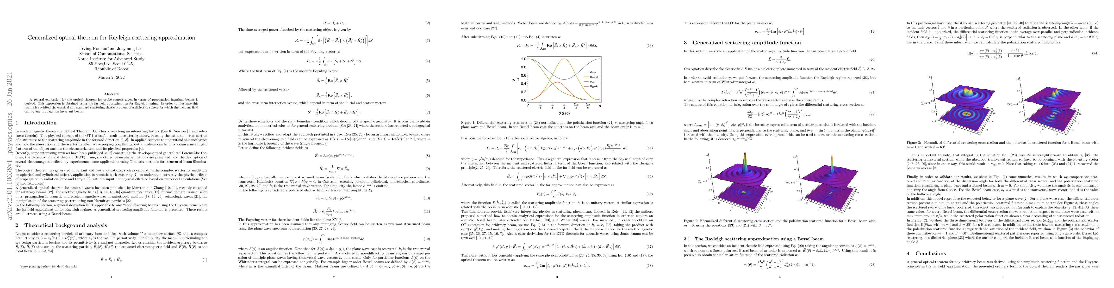 Summary: This paper derives a generalized optical theorem for Rayleigh scattering using far-field approximation, focusing on propagation invariant beams. It applies the results to the scattering problem of a dielectric sphere with any incident field type.