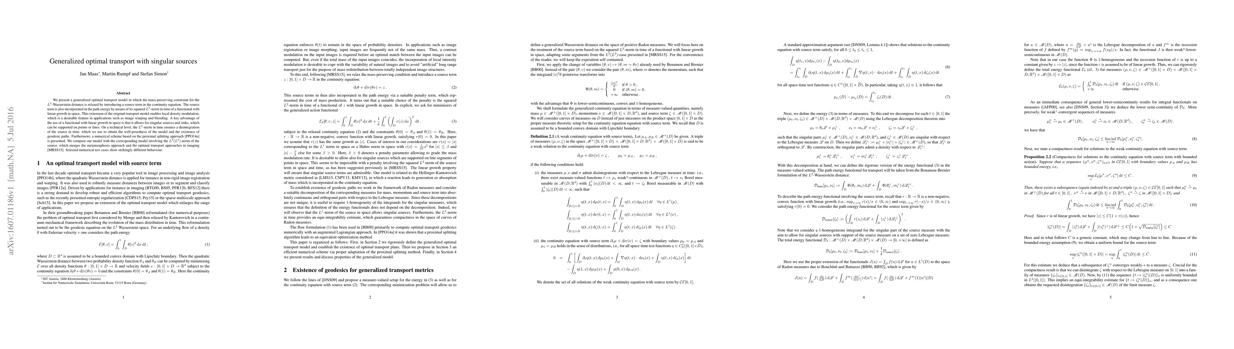 We present a generalized optimal transport model in which the mass-preserving constraint for the $L^2$-Wasserstein distance is relaxed by introducing a source term in the continuity equation. The source term is also incorporated in the path energy by means of its squared $L^2$-norm in time of a functional with linear growth in space. This extension of the original transport model enables local density modulation, which is a desirable feature in applications such as image warping and blending. A key advantage of the use of a functional with linear growth in space is that it allows for singular sources and sinks, which can be supported on points or lines. On a technical level, the $L^2$-norm in time ensures a disintegration of the source in time, which we use to obtain the well-posedness of the model and the existence of geodesic paths. Furthermore, a numerical scheme based on the proximal splitting approach (Papadakis et al., 2014) is presented. We compare our model with the corresponding model involving the $L^2(L^2)$-norm of the source, which merges the metamorphosis approach and the optimal transport approaches in imaging. Selected numerical test cases show strikingly different behaviour.
