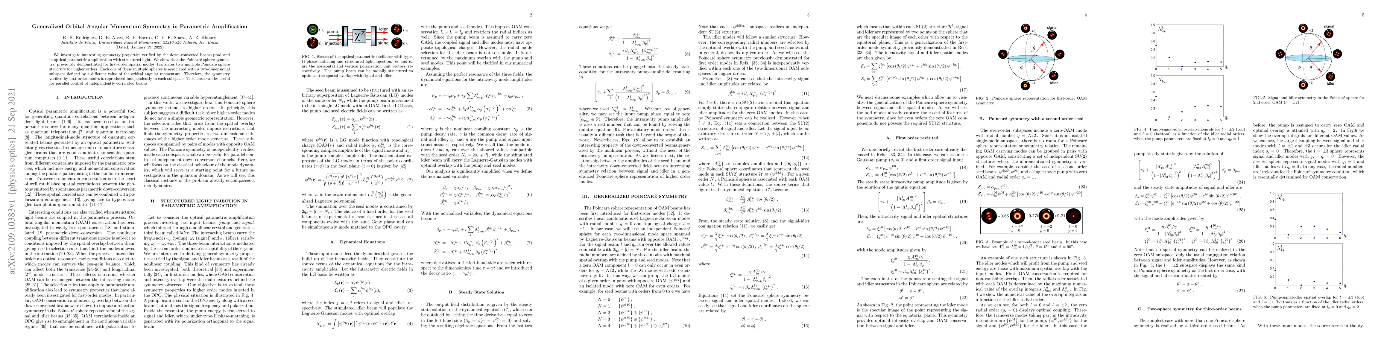 We investigate interesting symmetry properties verified by the down-converted beams produced in optical parametric amplification with structured light. We show that the Poincar\'e sphere symmetry, previously demonstrated for first-order spatial modes, translates to a multiple Poincar\'e sphere structure for higher orders. Each one of these multiple spheres is associated with a two-dimensional subspace defined by a different value of the orbital angular momentum. Therefore, the symmetry verified by first order modes is reproduced independently in each subspace. This effect can be useful for parallel control of independently correlated beams.