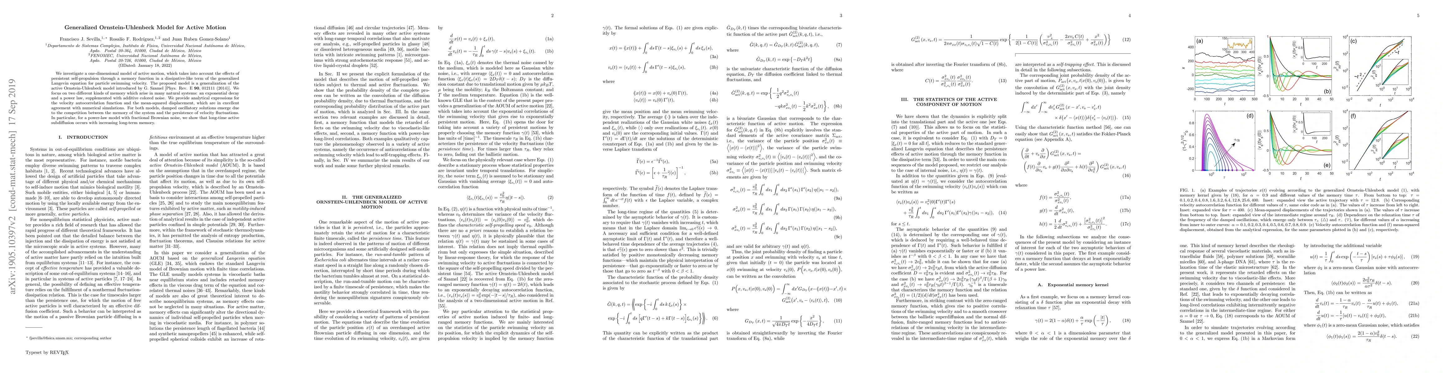 The paper introduces a generalized Ornstein-Uhlenbeck model that captures the effects of persistent self-propulsion and memory in active motion, providing analytical expressions for velocity autocorrelation and mean-squared displacement.