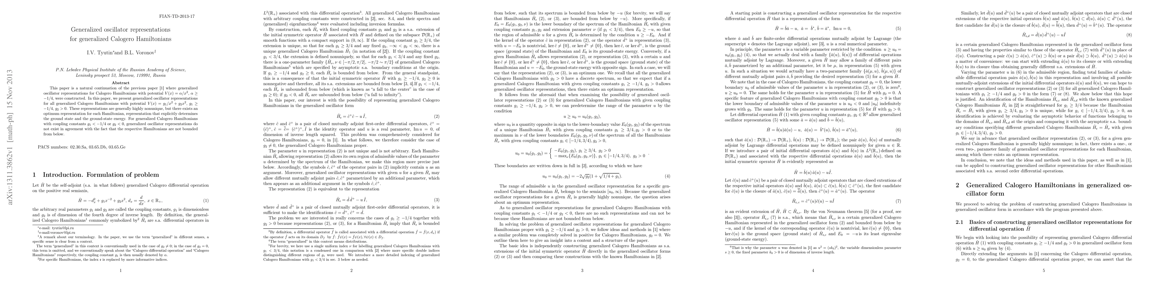 This paper is a natural continuation of the previous paper \cite{TyuVo13} where generalized oscillator representations for Calogero Hamiltonians with potential $V(x)=\alpha/x^2$, $\alpha\geq-1/4$, were constructed. In this paper, we present generalized oscillator representations for all generalized Calogero Hamiltonians with potential $V(x)=g_{1}/x^2+g_{2}x^2$, $g_{1}\geq-1/4$, $g_{2}>0$. These representations are generally highly nonunique, but there exists an optimum representation for each Hamiltonian, representation that explicitly determines the ground state and the ground-state energy. For generalized Calogero Hamiltonians with coupling constants $g_1<-1/4$ or $g_2<0$, generalized oscillator representations do not exist in agreement with the fact that the respective Hamiltonians are not bounded from below.