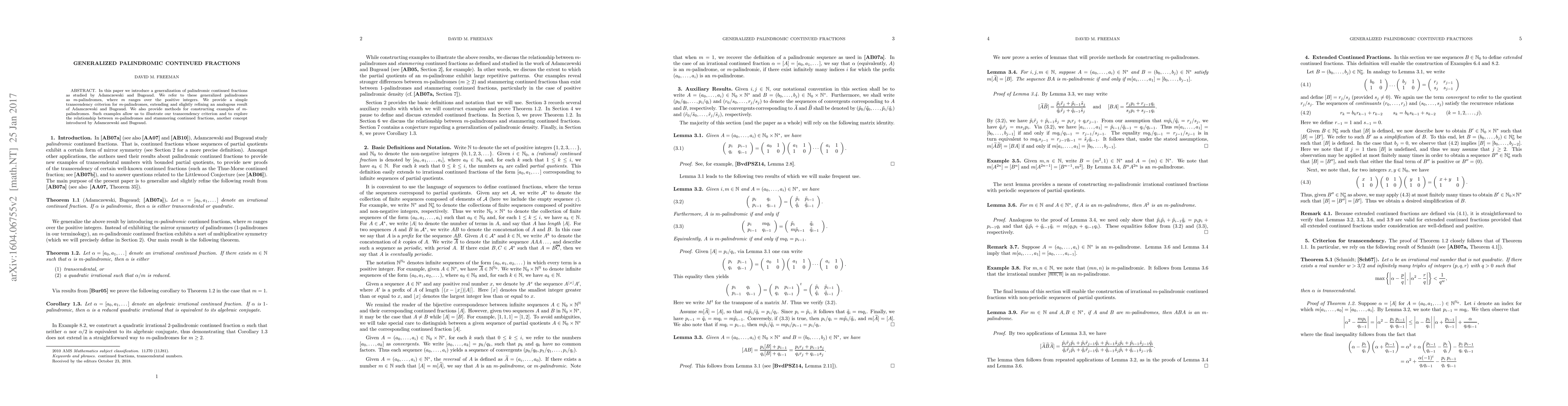 In this paper we introduce a generalization of palindromic continued fractions as studied by Adamczewski and Bugeaud. We refer to these generalized palindromes as $m$-palindromes, where $m$ ranges over the positive integers. We provide a simple transcendence criterion for $m$-palindromes, extending and slightly refining an analogous result of Adamczewski and Bugeaud. We also provide methods for constructing examples of $m$-palindromes. Such examples allow us to illustrate our transcendence criterion and to explore the relationship between $m$-palindromes and stammering continued fractions, another concept introduced by Adamczewski and Bugeaud.