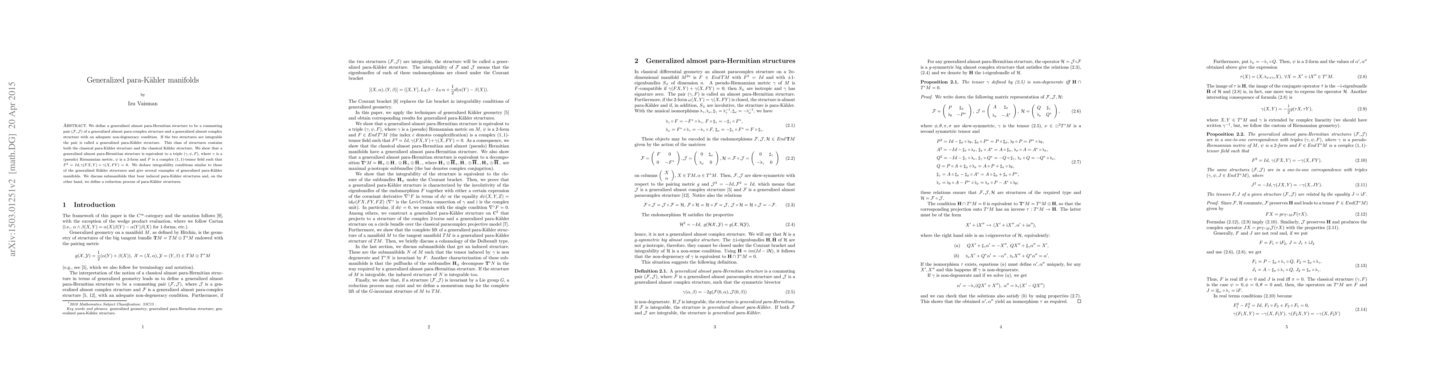 This paper defines generalized para-Kähler manifolds via commuting pairs of generalized almost para-complex and almost complex structures, integrating to form para-Kähler structures. It also presents an equivalent triple representation and discusses submanifolds and reduction processes for these structures.
